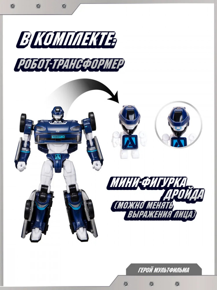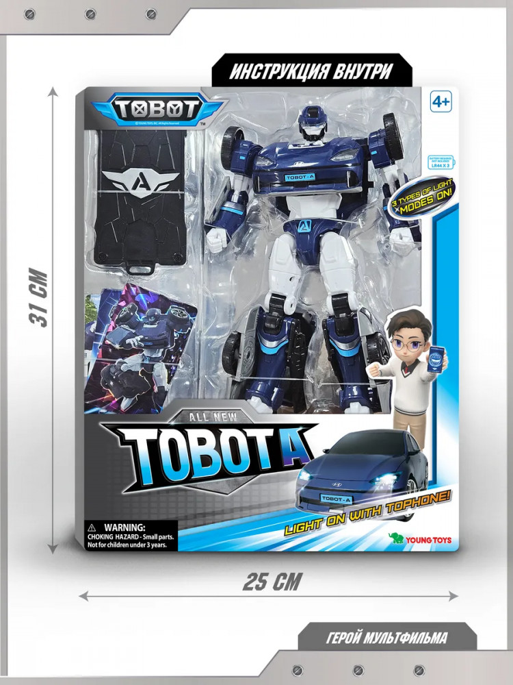 💳 Оплатить за товар можно при получении 🇰🇿 Есть бесплатная доставка по Казахстану от 1 дня 🎁 Копите бонусы с каждой покупки Игрушка-трансформер Тобот A — обновлённая версия любимого героя мультсериала «Тоботы». Является 100% оригинальным лицензионным продуктом. Тобот трансформируется в машинку-прототип Hyundai Motors IONIQ6 и обратно. Машинка имеет световые эффекты. При прикосновении дисплея с машинкой, у неё подсвечивается корпус тремя разными режимами, что придаёт игре динамичности. В комплекте 1 робот с мини-фигуркой внутри, 3 карточки, 1 интерактивный дисплей. Встраиваемая мини фигурка дройда с меняющимися выражениями лица, которые можно носить с собой и разыгрывать роли в любое время. В набор входит инструкция в картинках. Игрушки по мотивам мультгероев всегда вызывают повышенный спрос у детей, развивая при этом фантазию. Кроме того, игрушка-трансформер хорошо развивает мелкую моторику рук и пространственное мышление. Отличный подарок по любому поводу. Порадуйте своего ребенка Тоботом А или соберите целую коллекцию Тоботов! Весь товар сертифицирован. |