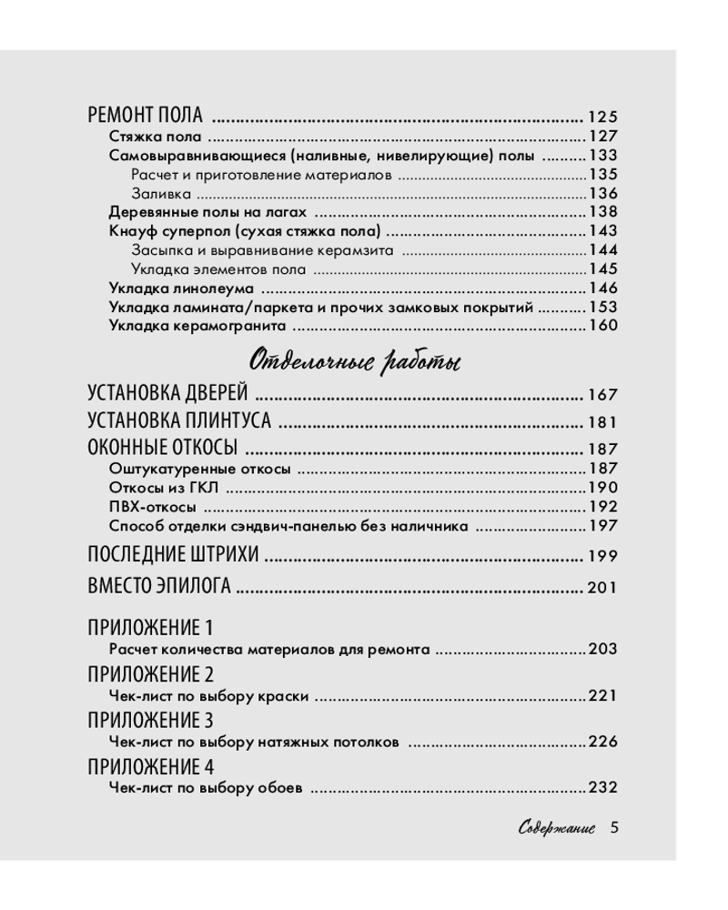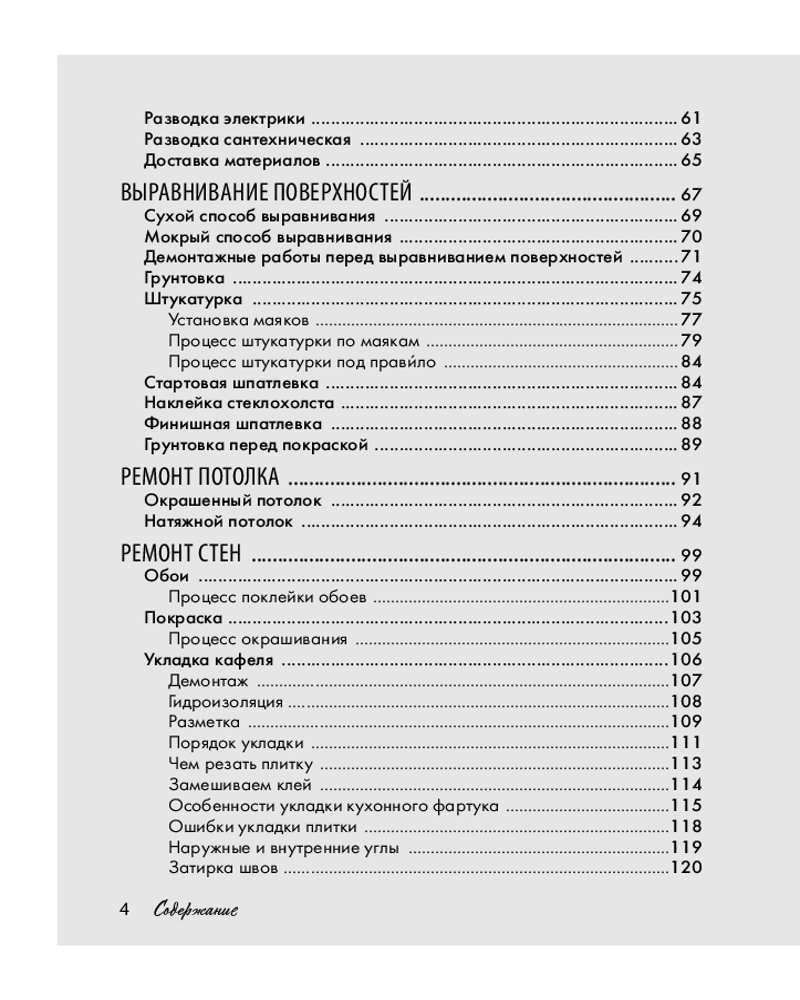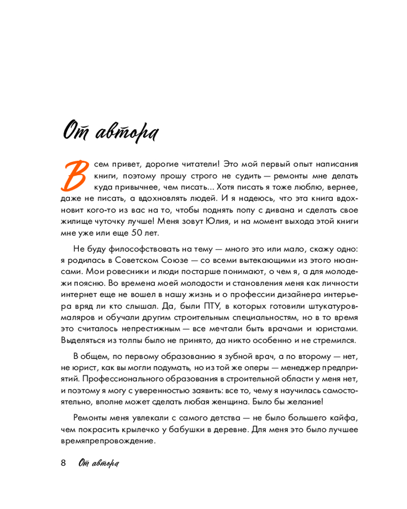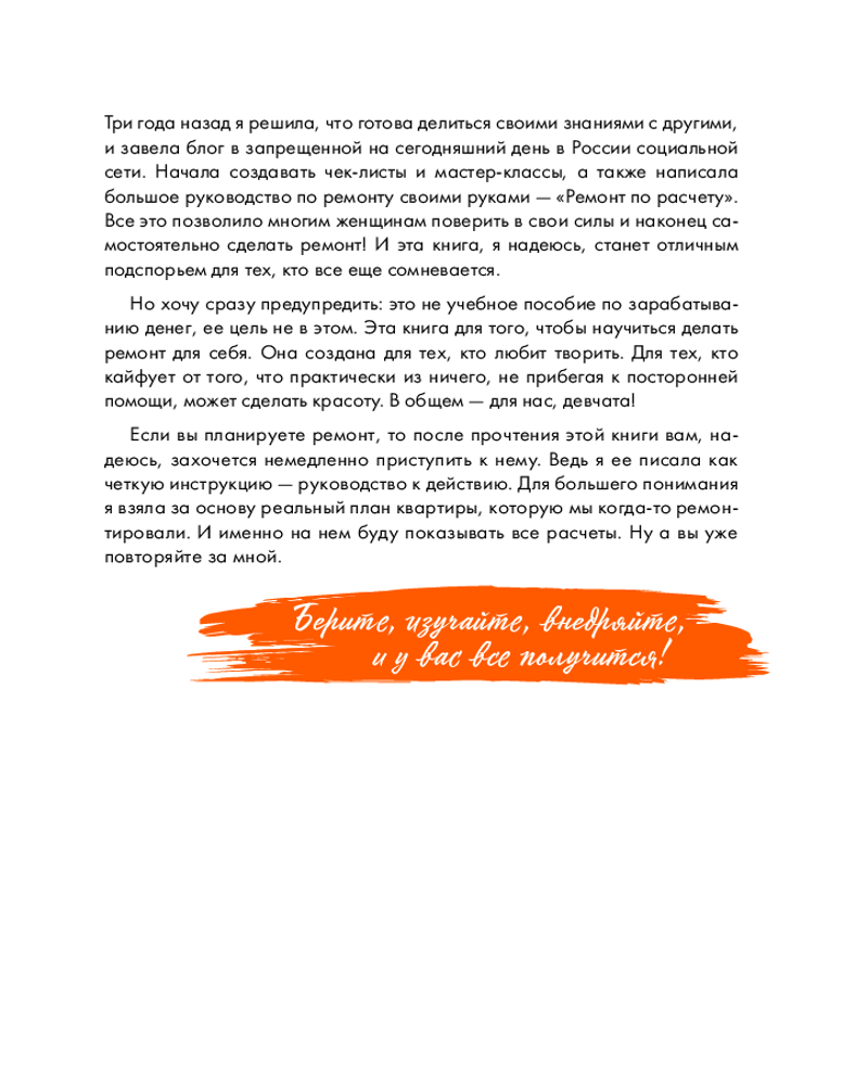 Эта книга — подробное руководство по всем этапам ремонта от женщины для женщин. Она научит вас не только грамотно контролировать процесс, но и общаться с бригадой, проверять результаты и, при необходимости, делать некоторые работы самостоятельно. Также вы научитесь составлять смету, подбирать бригаду, рассчитывать, в каком количестве и какие материалы нужны.