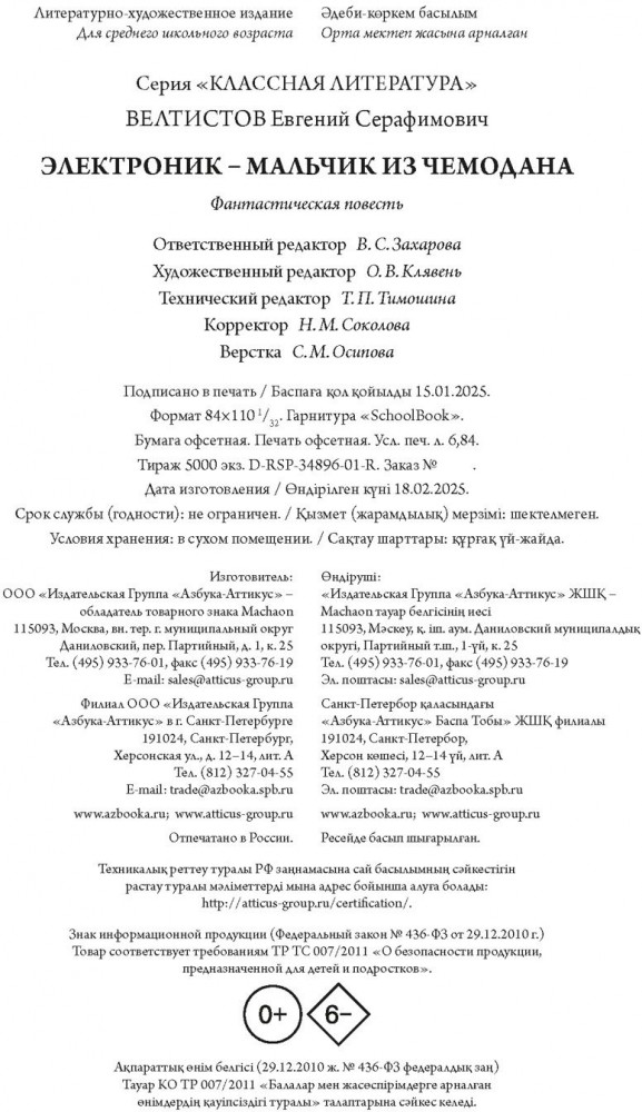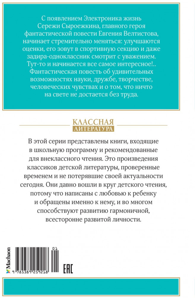 💳 Оплатить за товар можно при получении 🇰🇿 Есть бесплатная доставка по Казахстану от 1 дня 🎁 Копите бонусы с каждой покупки Серия: Классная литература С появлением Электроника, жизнь Серёжи Сыроежкина, главного героя фантастической повести Евгения Велтистова, начинает стремительно меняться: улучшаются оценки, его зовут в спортивную секцию, и даже задира-одноклассник смотрит с уважением. Тут-то и начинается всё самое интересное!.. Фантастическая повесть об удивительных возможностях науки, дружбе, творчестве, человеческих чувствах и о том, что ни что на свете не достаётся без труда. |