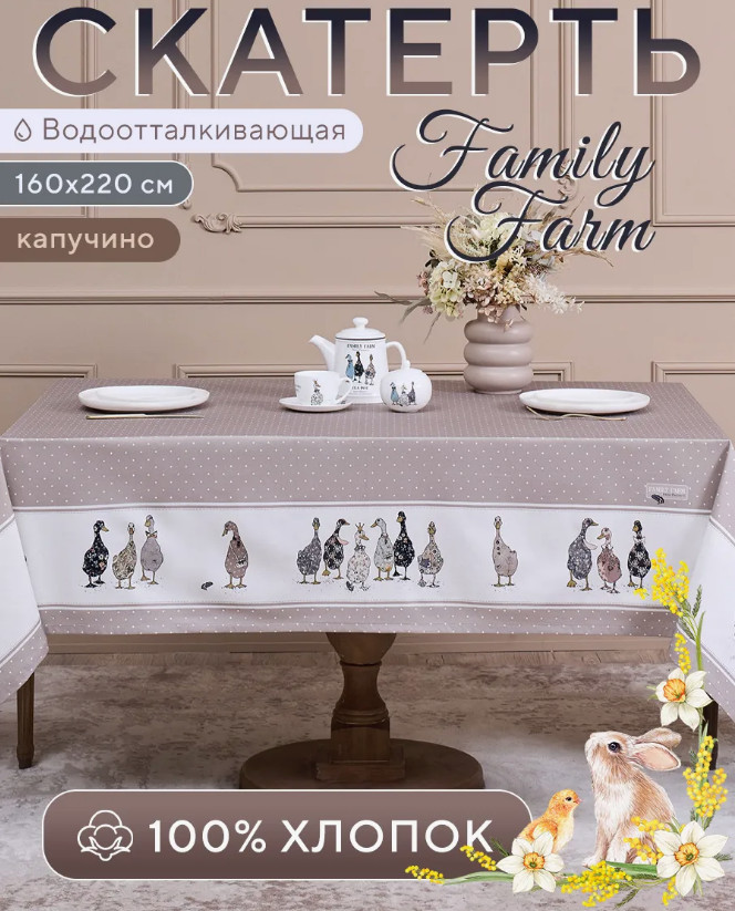 Круглая скатерть создана производителем Lefard по эксклюзивному дизайну для серии посуды «Family farm» бренда Lefard. Прекрасно подойдет для любого стола. Она изготовлена из плотного хлопкового текстиля с водоотталкивающей пропиткой, за счёт которой скатерть становится непромокаемой и с неё легко убрать пролитую жидкость. Плотность ткани составляет 190 гр\м2, она имеет приятную структуру в мелкий рубчик и называется твил. Состав ткани 100% хлопок. Главными преимуществами твила являются износостойкость, плотность и лёгкий красивый блеск. Эта ткань не заламывается и не мнется. Скатерть из твила выглядит аккуратно и элегантно.