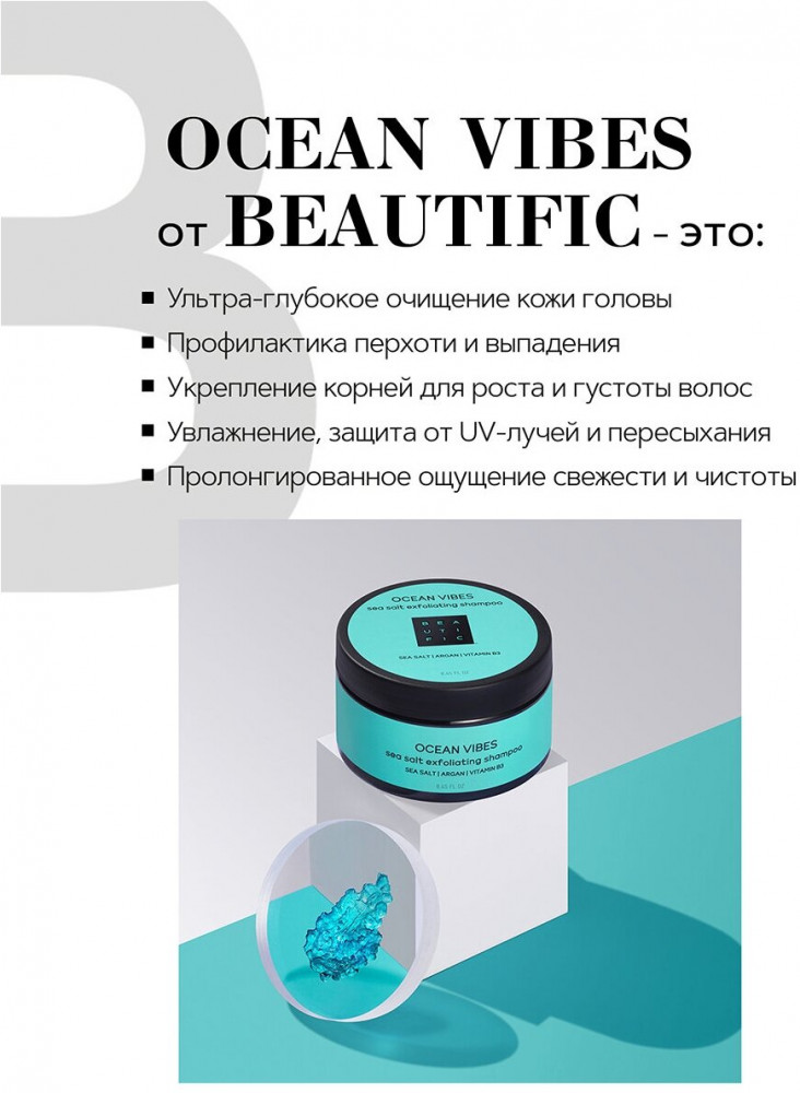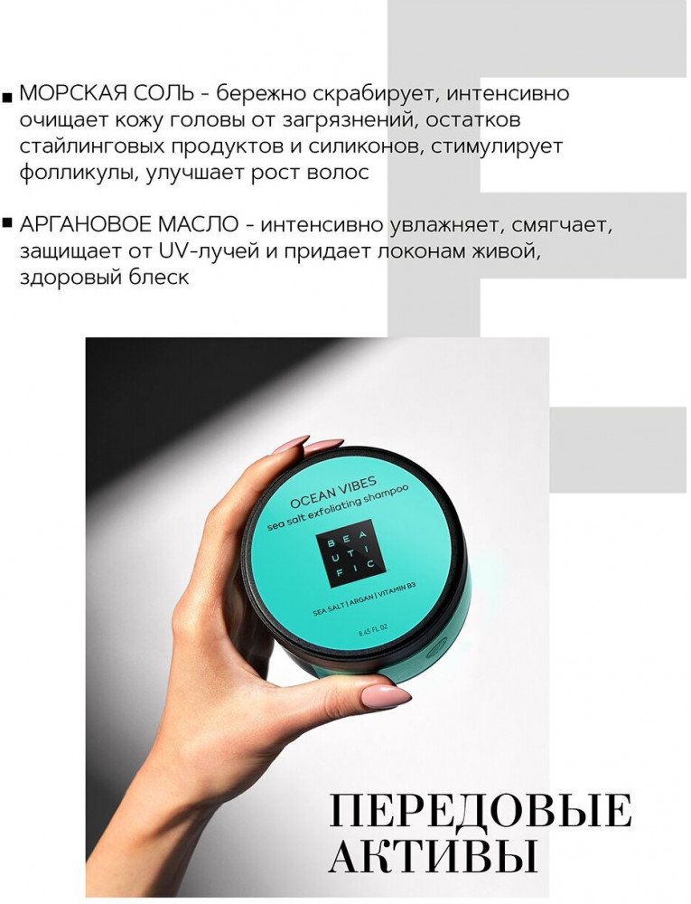 Beautific Скраб для волос и скальпа пенящийся «Ocean vibes»В данный момент этот товар отсутствует в продаже. Возможно, у нас найдется аналогичный или похожий товар здесь. Хочешь свежести морского бриза? Пусти его прямо в свои волосы вместе с формулой «Ocean vibes». Комплекс минеральных солевых гранул и масла арганы захлестнет их волной заботы и восстановления. Глубоко очистит кожу головы и волосы от средств для укладки, нормализует выработку себума, защитит от перхоти и улучшит рост, стимулируя волосяные фолликулы. Взгляни на красоту своих волос по-новому, позволь им быть густыми, увлажненными и живыми. А себе — наслаждение длительной свежестью моря, потерявшегося в твоих волосах. Без силиконов, парабенов, минеральных масел — для настоящей и естественной тебя. |