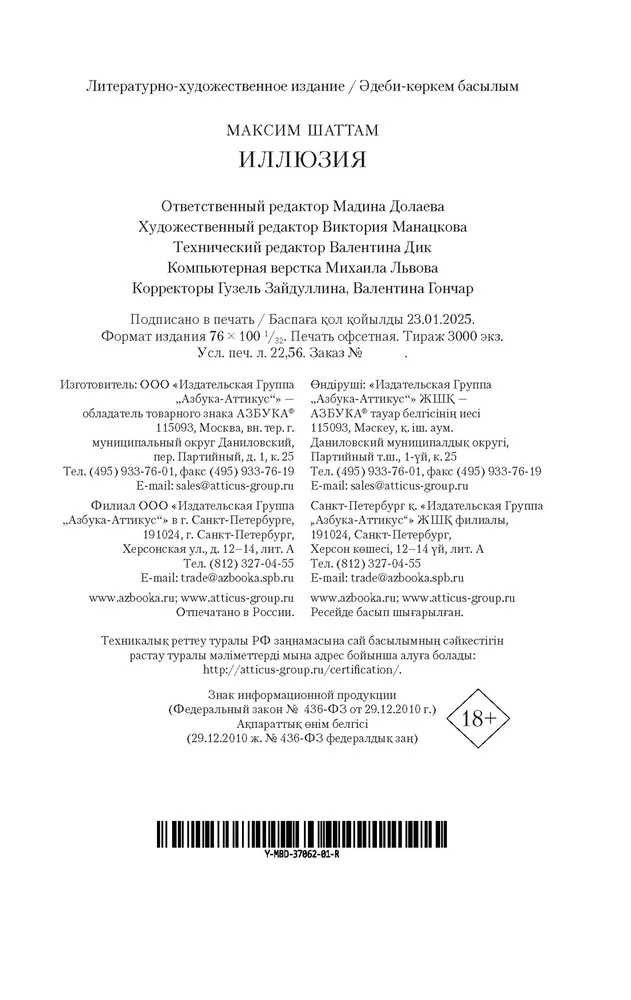 💳 Оплатить за товар можно при получении 🇰🇿 Есть бесплатная доставка по Казахстану от 1 дня 🎁 Копите бонусы с каждой покупки Серия: Звезды мирового детектива (обложка) «Иллюзия» Максима Шаттама — мистический триллер в духе Жан-Кристофа Гранже и Франка Тилье, от мастера французской остросюжетной литературы. |