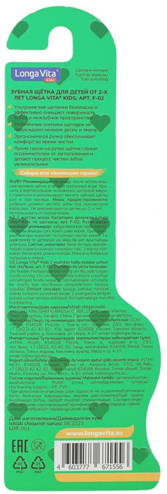 💳 Оплатить за товар можно при получении 🇰🇿 Есть бесплатная доставка по Казахстану от 1 дня 🎁 Копите бонусы с каждой покупки Ультрамягкие щетинки безопасно и эффективно очищают поверхность зубов и межзубное пространство. Утонченные кончики щетинок не повреждают нежную десну и эмаль. Эргономичная ручка обеспечивает комфорт во время чистки. Яркие герои на ручке щетки служат ограничителем от заглатывания и делают процесс процесс чистки зубов увлекательнее |