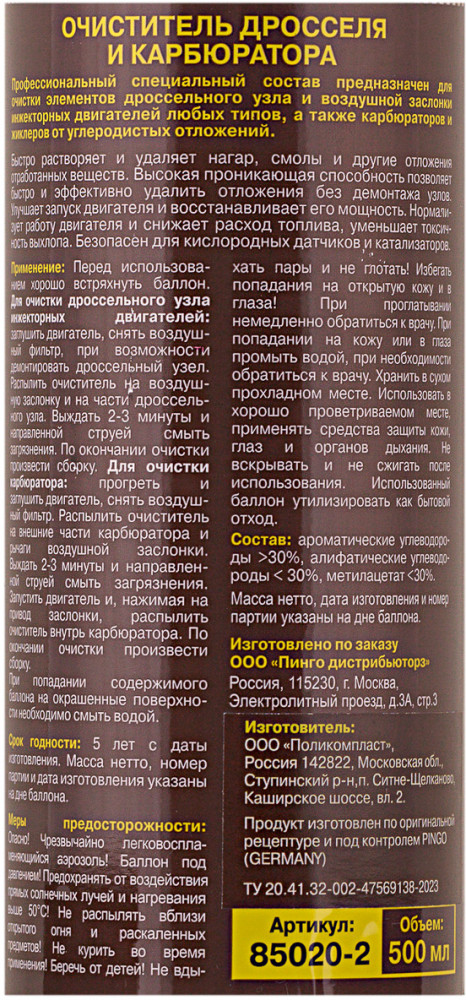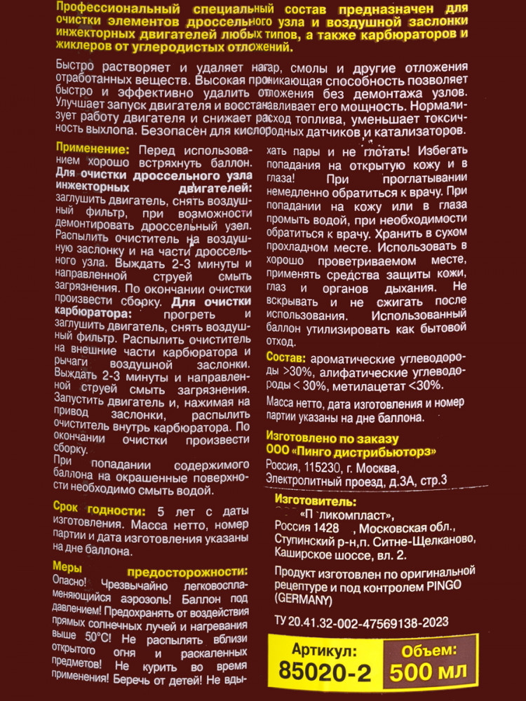Pingo Очиститель дросселя и карбюратораВ данный момент этот товар отсутствует в продаже. Возможно, у нас найдется аналогичный или похожий товар здесь. Профессиональный специальный состав предназначен для очистки элементов дроссельного узла и воздушной заслонки инжекторных двигателей любых типов в автомобилях, а также карбюраторов и жиклеров от углеродистых отложений. Удаляет смолы и нагар, нормализует работу и восстанавливает мощность двигателя, улучшает запуск двигателя и снижает расход топлива. Применяется при каждой операции по очистке дроссельного узла. |