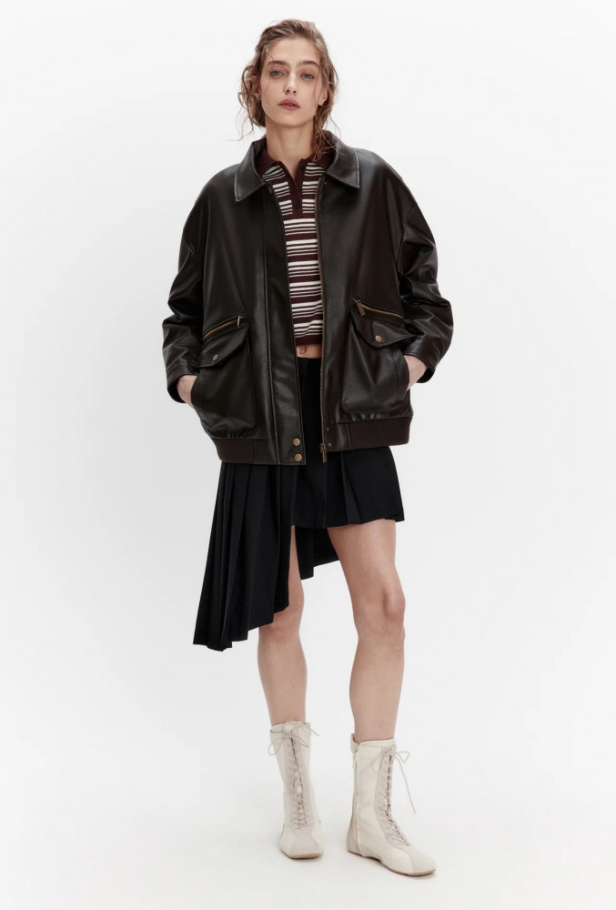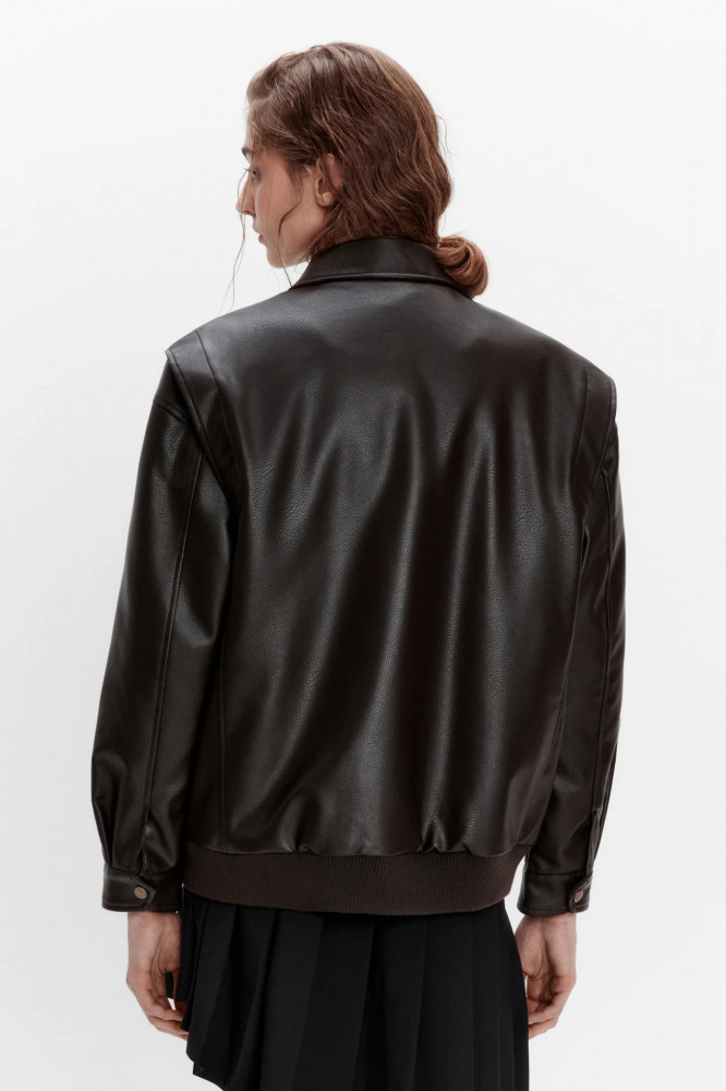 Женская куртка-бомбер свободного кроя из гладкой искусственной кожи с подкладкой и искусственным утеплителем (синтепон). Отложной рубашечный воротник. Длинные свободные рукава с широкими манжетами на кнопках, спущенная линия плеча с имитацией второго слоя на спине. Два боковых накладных кармана с клапанами на кнопке, два боковых прорезных кармана на молнии. Застежка на молнию и планку с кнопками спереди. Нижний край на эластичной резинке без разрезов.