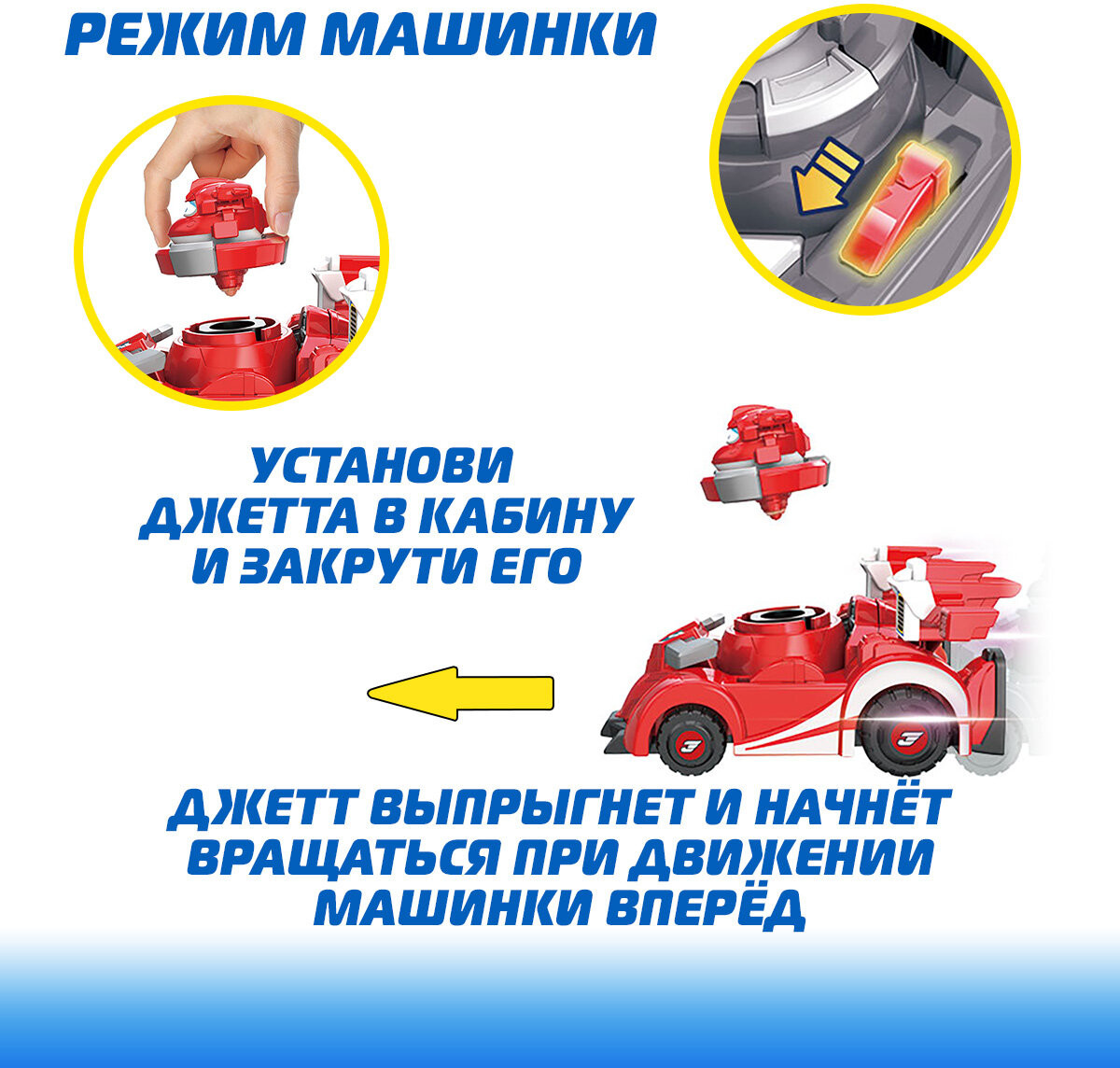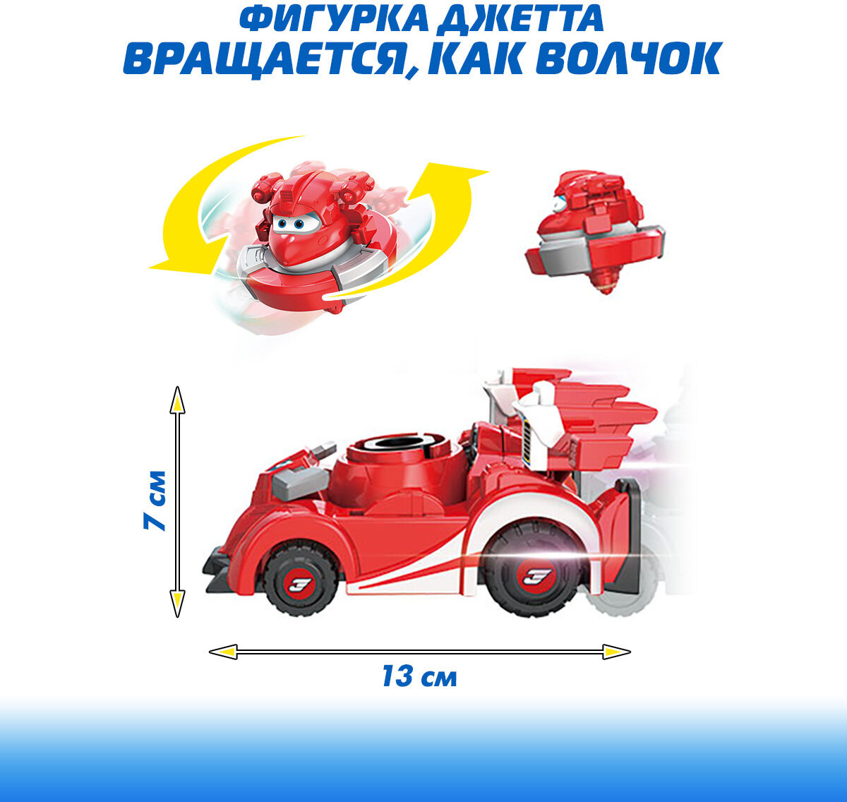 💳 Оплатить за товар можно при получении 🇰🇿 Есть бесплатная доставка по Казахстану от 1 дня 🎁 Копите бонусы с каждой покупки Встречайте новинку Супер Крылья — машинка с вращающимся Джеттом за рулём. Игрушка имеет 2 режима: режим автомобиля и режим вращения. Можно запустить Джетта одним нажатием на кнопку или начать двигать автомобиль. При движении машинки, из неё выскакивает фигурка Джетта, её можно снова прикрепить к автомобилю. В набор входит машинка и фигурка вращающегося Джетта. |
