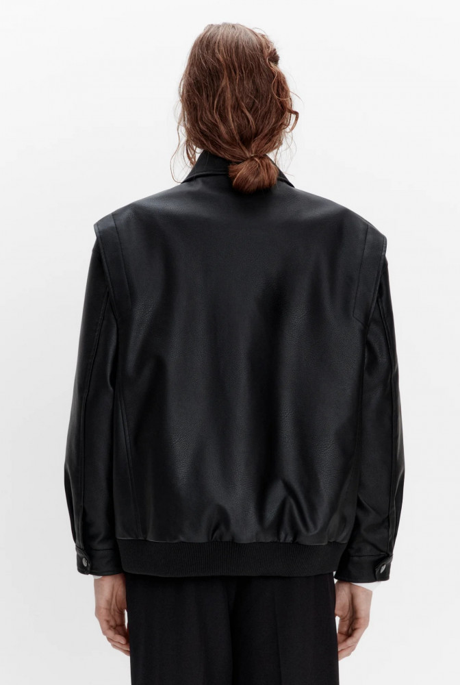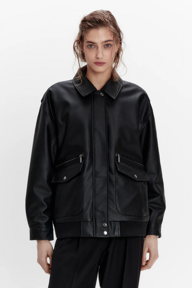 Женская куртка-бомбер свободного кроя из гладкой искусственной кожи с подкладкой и искусственным утеплителем (синтепон). Отложной рубашечный воротник. Длинные свободные рукава с широкими манжетами на кнопках, спущенная линия плеча с имитацией второго слоя на спине. Два боковых накладных кармана с клапанами на кнопке, два боковых прорезных кармана на молнии. Застежка на молнию и планку с кнопками спереди. Нижний край на эластичной резинке без разрезов.