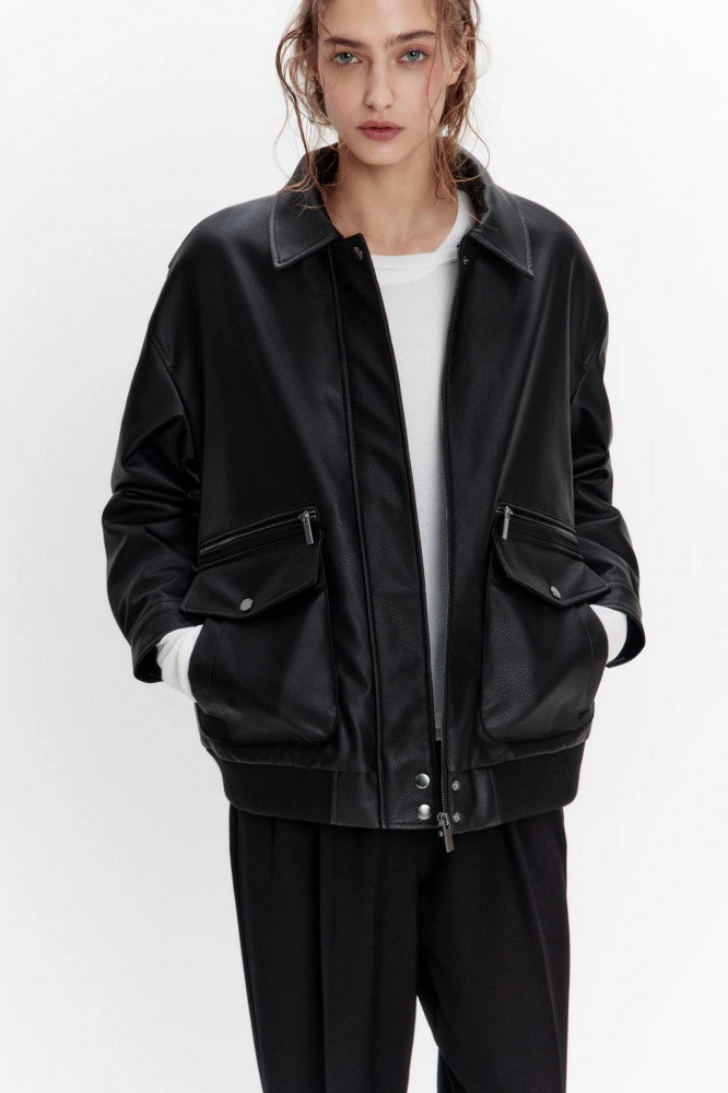 Женская куртка-бомбер свободного кроя из гладкой искусственной кожи с подкладкой и искусственным утеплителем (синтепон). Отложной рубашечный воротник. Длинные свободные рукава с широкими манжетами на кнопках, спущенная линия плеча с имитацией второго слоя на спине. Два боковых накладных кармана с клапанами на кнопке, два боковых прорезных кармана на молнии. Застежка на молнию и планку с кнопками спереди. Нижний край на эластичной резинке без разрезов.