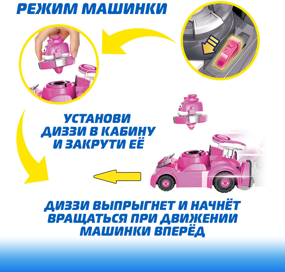 💳 Оплатить за товар можно при получении 🇰🇿 Есть бесплатная доставка по Казахстану от 1 дня 🎁 Копите бонусы с каждой покупки Встречайте новинку Супер Крылья — машинка с вращающейся Диззи за рулём. Игрушка имеет 2 режима: режим автомобиля и режим вращения. Можно запустить Диззи одним нажатием на кнопку или начать двигать автомобиль. При движении машинки, из неё выскакивает фигурка Диззи, её можно снова прикрепить к автомобилю. В набор входит машинка и фигурка вращающейся Диззи. |