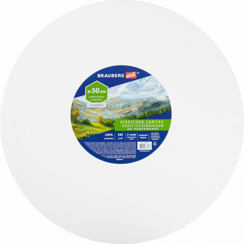 Холст на подрамнике используется для работы масляными, темперными и акриловыми красками. Предназначен для учеников и студентов художественных школ, художников. Изготовлен из 100% хлопка плотностью 380 г/м2, покрытого акриловым грунтом. Хлопковое полотно характеризуется ровной поверхностью со слабовыраженным рельефом. Односторонний трехслойный акриловый грунт позволяет сохранить цвета неизменными, не допуская их прожухания. Холст круглой формы на подрамнике полностью готов к работе. Диаметр — 50 см. Подрамник — 15×30 мм.