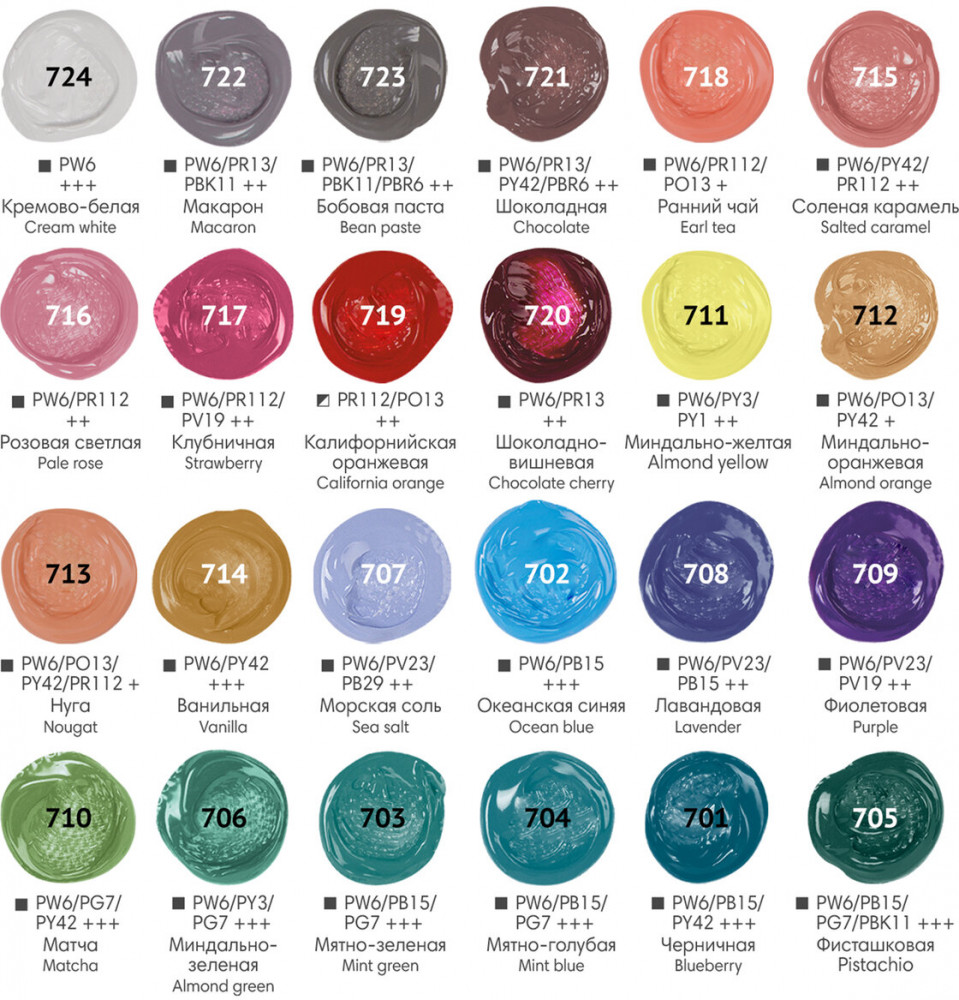 В наборе представлены 24 краски пастельных цветов: кремово-белая (724), макарон (722), бобовая паста (723), шоколадная (721), ранний чай (718), соленая карамель (715), розовая светлая (716), клубничная (717), калифорнийская оранжевая (719), шоколадно-вишневая (720), миндально-желтая (711), миндально-оранжевая (712), нуга (713), ванильная (714), морская соль (707), океанская синяя (702), лавандовая (708), фиолетовая (709), матча (710), миндально-зеленая (706), мятно-зеленая (703), мятно-голубая (704), черничная (701), фисташковая (705).