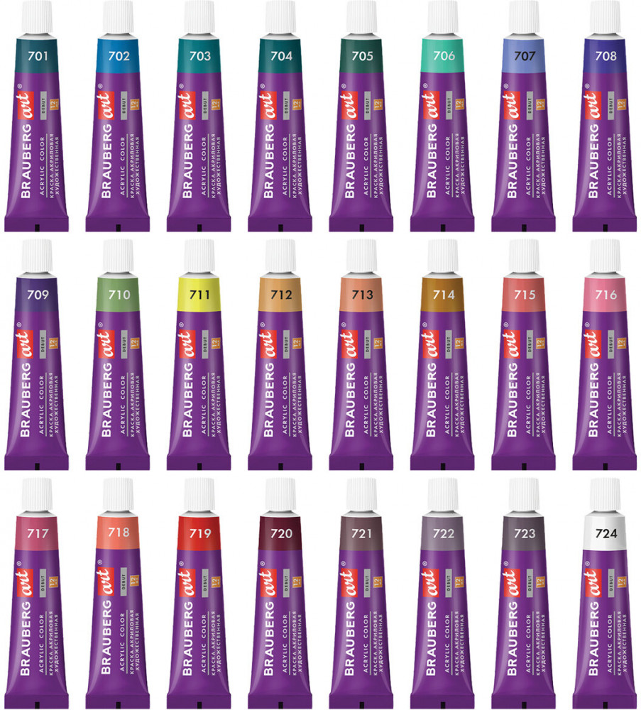 Художественные акриловые краски предназначены для живописи и декоративных работ. Краски с матовым финишем легко наносятся практически на любую поверхность. Быстро высыхают без изменения цвета. Обладают отличной укрывистостью и светостойкостью. Разбавляются водой. Не токсичны и не имеют неприятного резкого запаха. Краски в тубах объемом 12 мл поставляются в картонной коробке.