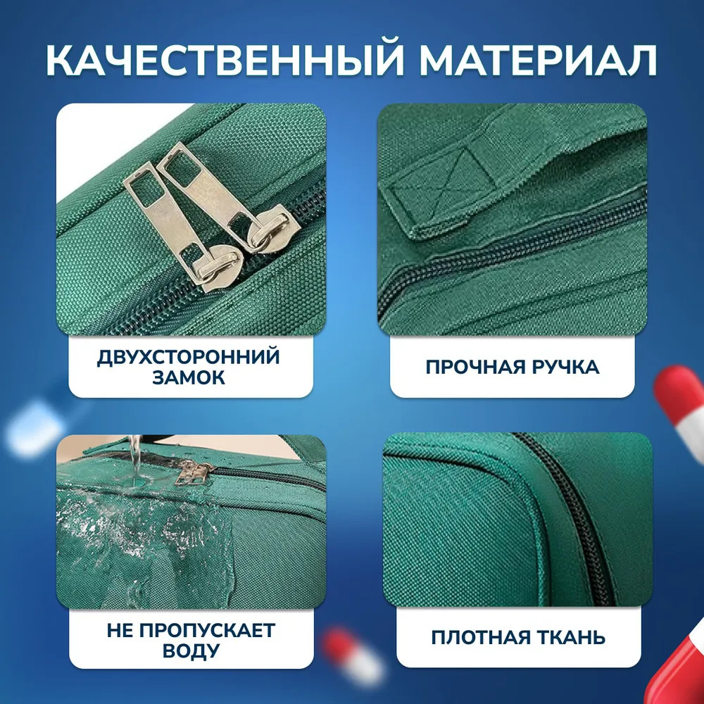 Аптечка красивого цвета изготовлена из лёгкого, износостойкого материала, устойчивого к плесени, ткань Оксфорд. Органайзер имеет яркий и стильный дизайн, его легко носить с собой, благодаря эргономичной ручке, а удобная застёжка-молния обеспечит быстрый доступ к содержимому.