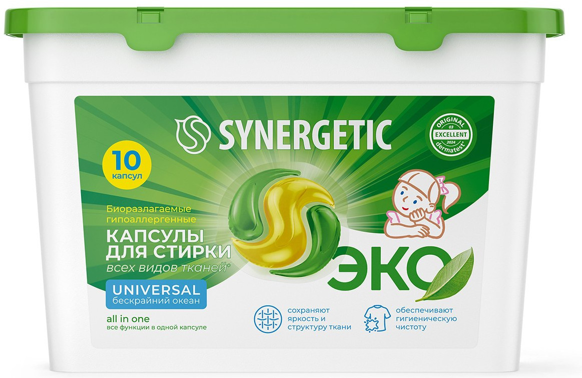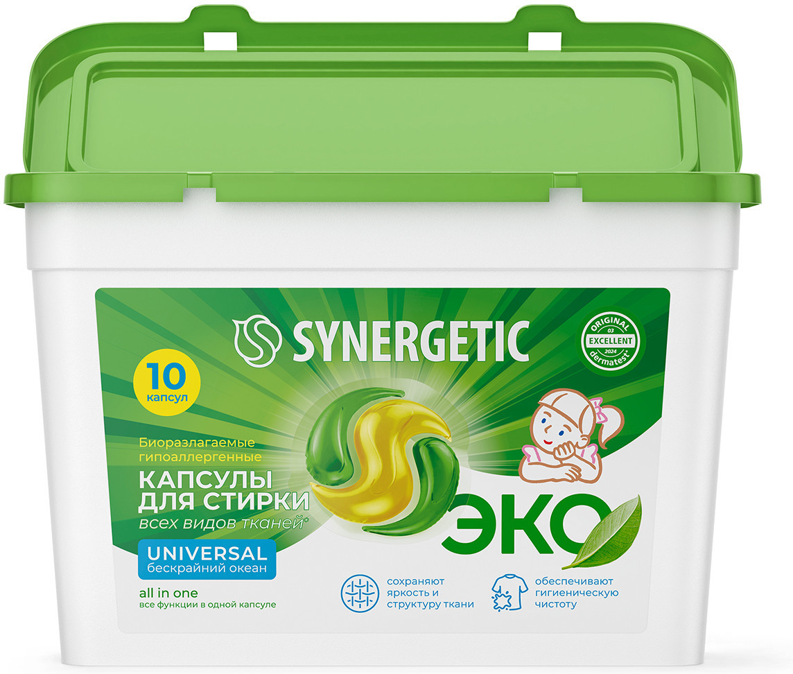 Биоразлагаемые концентрированные гипоаллергенные капсулы для стирки всех видов тканей Synergetic universal обеспечивают гигиеническую чистоту, устраняя пятна и неприятные запахи. Комбинация энзимов и растительных ПАВ эффективно удаляет загрязнения и свежие пятна с волокон ткани даже в холодной воде. Функциональные добавки сохраняют насыщенность цвета, первоначальный вид, прочность и структуру ткани. Гипоаллергенная отдушка с натуральными эфирными маслами лаванды и литсеи придаёт белью свежий аромат бескрайнего океана. Капсулы подходят для стирки детского белья и одежды людей с чувствительной кожей. Предназначены для стирки всех видов тканей (кроме деликатных и мембранных) в стиральных машинах любого типа при температуре от 25 °С до 90 °С.