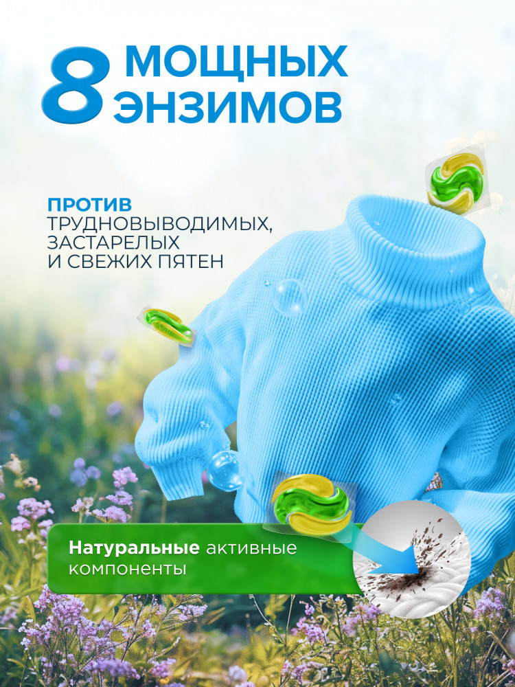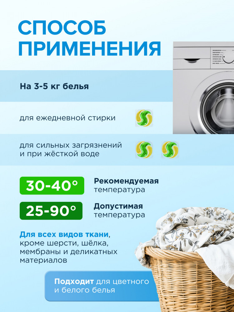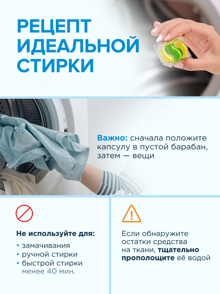 Средство не содержит фосфатов, фосфонатов, акрилатов, агрессивных ПАВ, SLS, ЭДТА. Капсулы дерматологически протестированы независимым институтом Dermatest