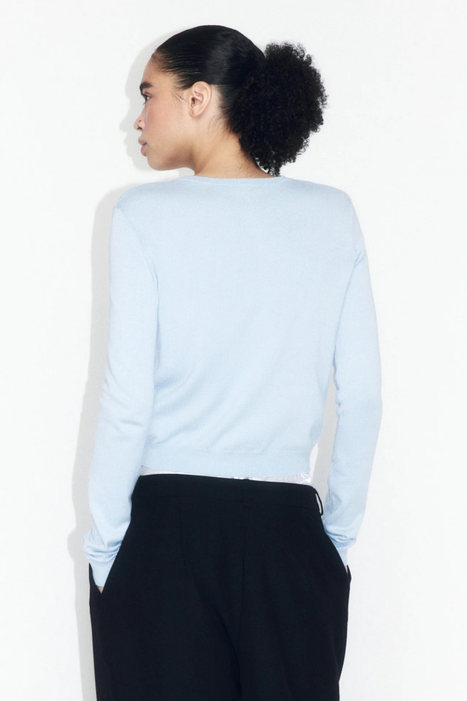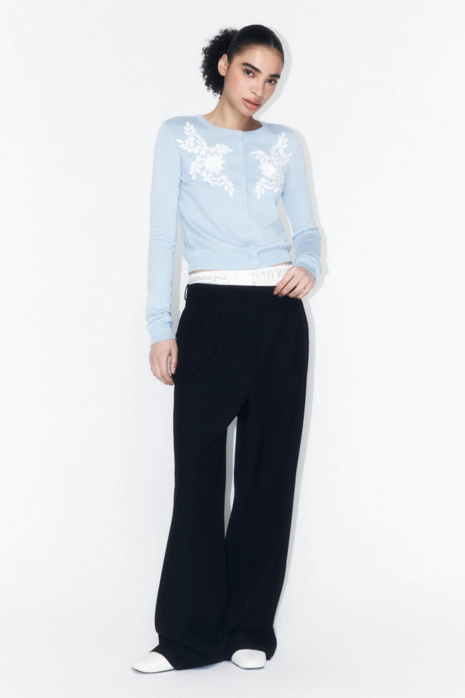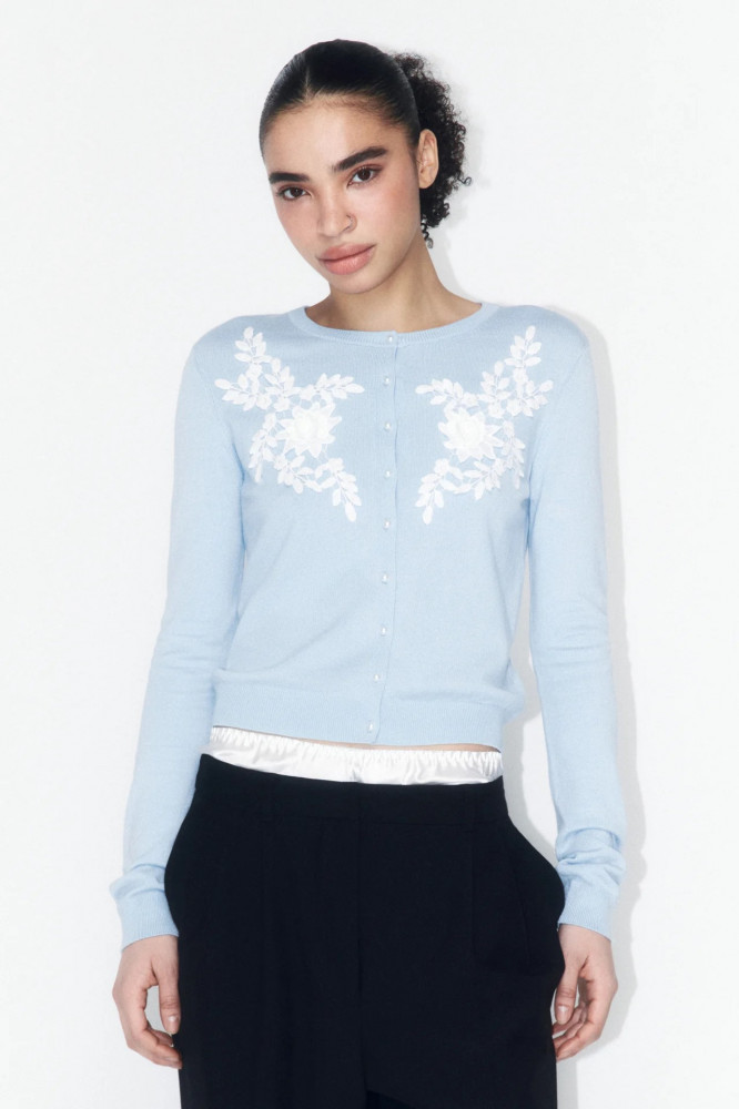 Джемпер на пуговицах с цветочной вышивкой представлен в самых актуальных оттенках сезона — голубом и цвете сливочного масла. Универсальный и удобный, он подарит лёгкое весеннее настроение. Его можно носить как самостоятельный элемент гардероба или в составе многослойных образов, сочетать с рваными джинсами или брюками из кожи для создания эффектного образа в стиле гранж. В паре с атласными юбками кардиган поможет создать соблазнительный и нежный лук для романтических встреч.