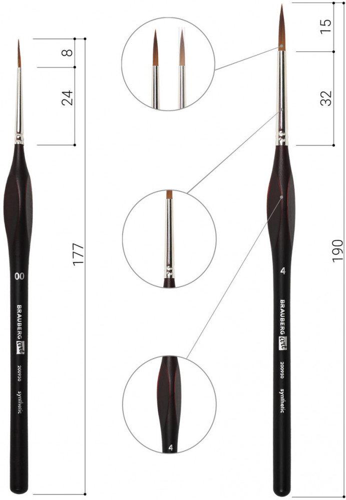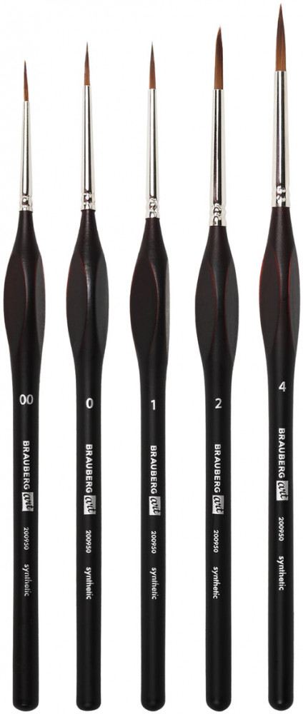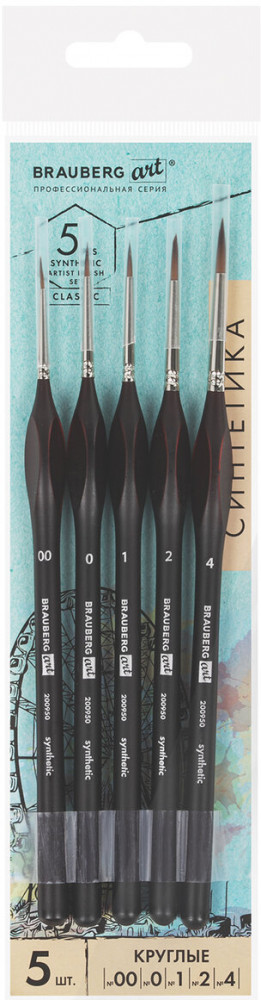 Кисти изготовлены с применением высококачественной синтетики. Отличаются универсальностью в использовании, обусловленной упругостью ворса и прекрасными впитывающими свойствами пучка. Короткая ручка из древесины покрыта лаком, что защищает ее от воздействия красок и влаги. Отличительная особенность ручки — эргономичность. Форма пучка — круглая № 00, 0, 1, 2,4. Номер кисти соответствует реальной ширине пучка в миллиметрах. Упаковка — пакет с европодвесом и картонной подложкой.