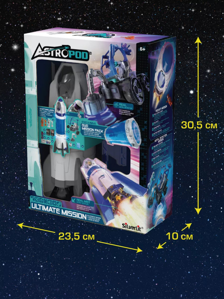 Astropod Набор игровой «Миссия: Ракета»В данный момент этот товар отсутствует в продаже. Возможно, у нас найдется аналогичный или похожий товар здесь. Игрушка Миссия Ракета от Сильверлит это развивающая игрушка в виде космической ракеты и металлоискателя! Космическую Ракету можно изменять. Её можно сделать совсем маленькой (из 2 частей) и увеличивать при помощи капсул. В наборе есть 1 капсула, поэтому малыш сразу может заняться изменением внешнего вида ракеты. А приобретая любые новые миссии Astropod, ваш ребёнок сможет делать свою космическую ракету ещё больше. В ракете много функций которые помогает погрузиться в мир астронавтов и космоса: звук и свет — кнопка запуска инициирует звуки запуска (не каждый запуск удачен ) со световыми эффектами. Пар — отдельная кнопка для водяного пара и имитации взлёта. В носовой части открывающееся кабина для пилота. Дополнительно с ракетой идёт игрушка в виде небольшого лунохода с функцией настоящего металлоискателя, который подаёт звуковой сигнал при приближении к металлическим предметам. Есть настройка чувствительности. В наборе 2 диска для поиска (металлоискатель работает на любой другой металл, например, монеты). В наборе: 21 деталь для сборки лунохода с металлоискателем; 2 детали для сборки ракеты; астронавт с подвижными руками и ногами, чтобы его можно было посадить; открывающееся капсула; канистра для воды. Габариты Ракеты с 1ой дополнительной секций: 9 (ширина) × 36 (высота) см. Габариты ровера: 14 (длина) × 10 (высота) см. Капсула совместима с другими капсулами серии Astropod. |