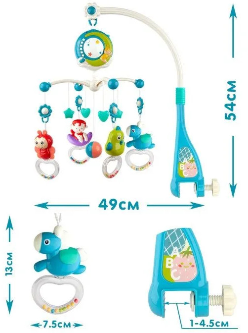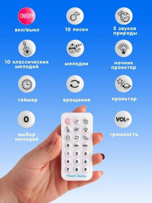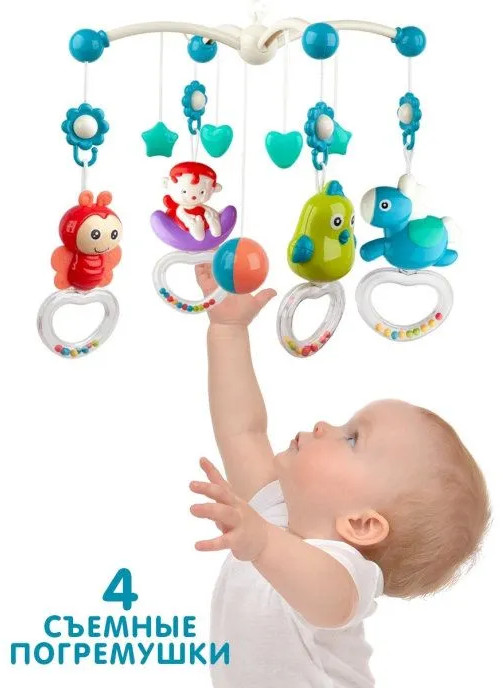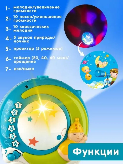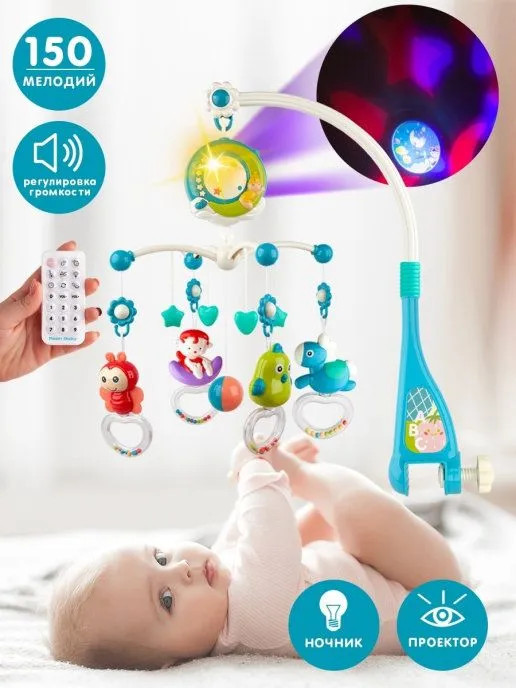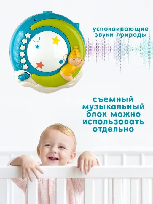 Многофункциональный музыкальный мобиль с проектором-ночником и 4 съемными игрушками-погремушками станет отличным подарком для новорожденного малыша! Уделите время себе, пока ваш малыш изучает тактильные яркие игрушки. 150 колыбельных, 10 детских песенок на английском, 10 классических мелодий, а также 5 разных природных звуков (шум волн, ручей, сверчки, лес, птицы) будут оказывать на малыша успокаивающий эффект. Громкость воспроизведения регулируется. Мобиль плавно вращается на 360 градусов. Проектор-ночник можно использовать как с включенными мелодиями, так и в беззвучном режиме (в режиме звуков природы нажмите два раза цифру 3). Проекция на потолок в виде звезд и луны, картинка. Благодаря ночнику в детской комнате, малыш гораздо быстрее уснет, не боясь темноты.