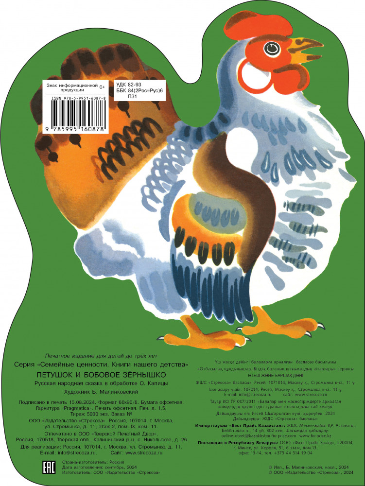 💳 Оплатить за товар можно при получении 🇰🇿 Есть бесплатная доставка по Казахстану от 1 дня 🎁 Копите бонусы с каждой покупки Серия: Семейные ценности. Книги нашего детства В вашем детстве наверняка было много замечательных любимых книг. Давайте познакомим с ними и новое поколение читателей. Клевал как-то петушок зернышки, да в спешке подавился. Не знал он, что торопиться опасно, можно попасть в беду. Ох и много усилий придется приложить заботливой курочке, чтобы спасти петушка! Оригинальная вырубка книги напоминает петушка. Поэтому можно не просто читать сказку, но и играть с ребенком. |