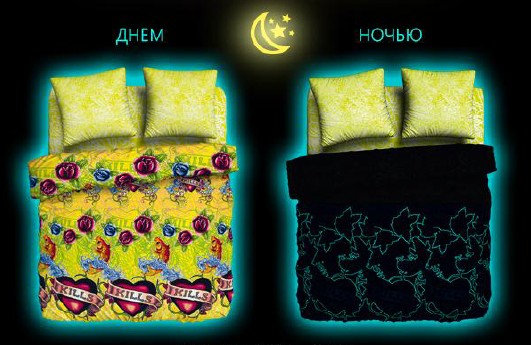 Светящиеся в темноте КПБ сделаны на основе качественной светящейся краски, которая наносится на специально подготовленную ткань.
