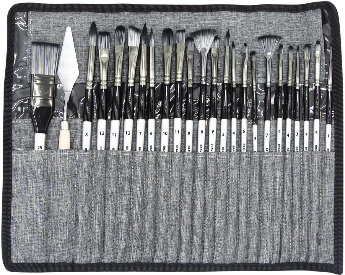 Серия: Art debut Кисти Brauberg прекрасно подходят для работы жидкими красками. Не теряют жесткость при намокании и одновременно позволяют удерживать максимальное количество краски в пучке. Кисти Brauberg Art Debut изготовлены с применением синтетики. Отличаются универсальностью в использовании, обусловленной упругостью ворса и прекрасными впитывающими свойствами пучка. Короткая ручка из древесины покрыта лаком, что защищает ее от воздействия красок и влаги. В набор входят 23 кисти различной формы, текстильный пенал-скрутка и мастихин.