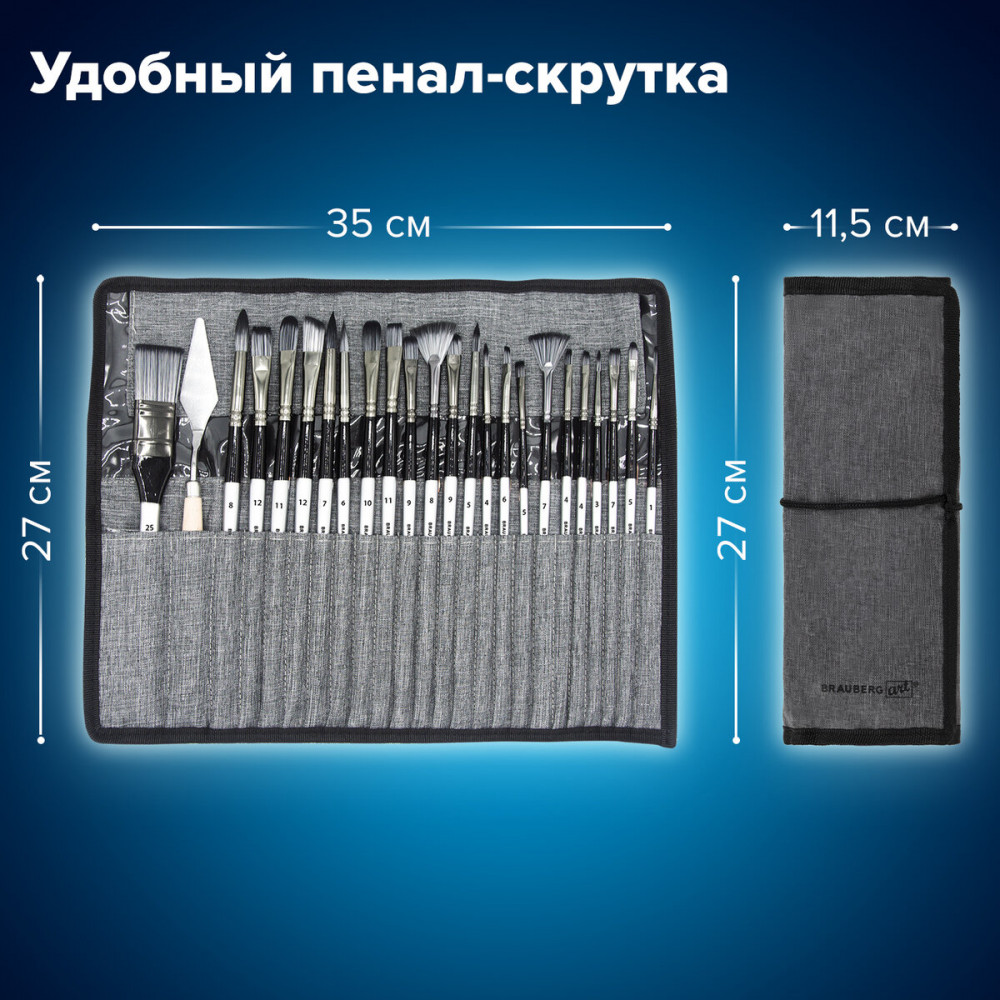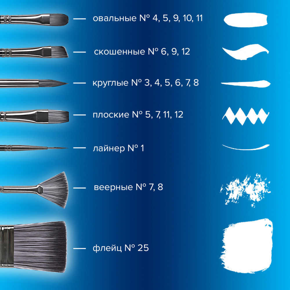 Формы кистей: скошенные — № 6, 9, 12, веерная — № 7, 8, лайнер — № 1, овальные — № 4, 5, 9, 10, 11, флейц — № 25, плоские — № 5, 7, 11, 12, круглые — № 3, 4, 5, 6, 7, 8. Номер кисти соответствует реальной ширине пучка в миллиметрах. Упаковка — текстильный пенал-скрутка.