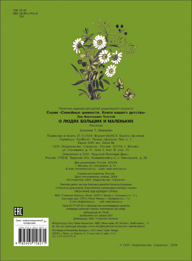 💳 Оплатить за товар можно при получении 🇰🇿 Есть бесплатная доставка по Казахстану от 1 дня 🎁 Копите бонусы с каждой покупки В вашем детстве наверняка было много замечательных любимых книг. Давайте познакомим с ними и новое поколение читателей. В книгу вошли маленькие простые рассказы, которые Лев Николаевич Толстой использовал для обучения детей чтению. |