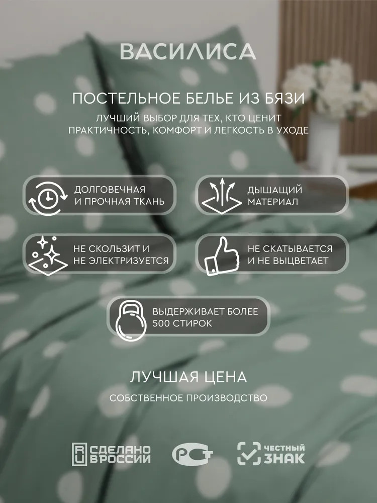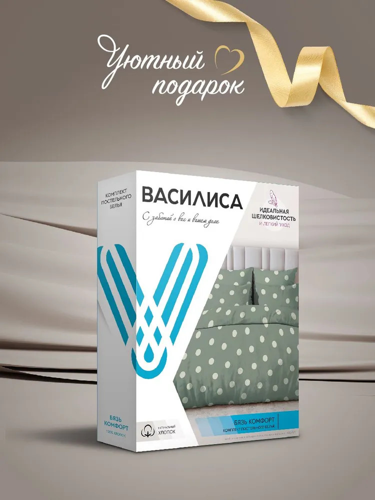 Постельное белье от торговой марки «Василиса» изготовлено из 100% хлопка. Натуральный хлопок абсолютно экологичен, не вызывает аллергии, хорошо пропускает воздух, позволяя телу дышать. При соблюдении рекомендаций по уходу, ткань легко стирается, не дает усадки и практически не мнется, позволяя гладить белье без отпаривания. Небольшой эффект накрахмаленной ткани позволяет идеально держать форму, меньше загрязняется и сминается, что позволяет сохранить эстетический вид изделия во время эксплуатации. Высокая плотность скрутки нитей ткани не подвержена образованию катышков. Способ застегивания наволочки – клапан шириной 25 см, что очень комфортно, при использовании наволочка не раскрывается, пододеяльника – отверстие без застежки по краю изделия с подвернутым краем. А красивая современная упаковка как неотъемлемая часть подарка для Вас и Ваших близких, неся радость и чувство предвкушения.