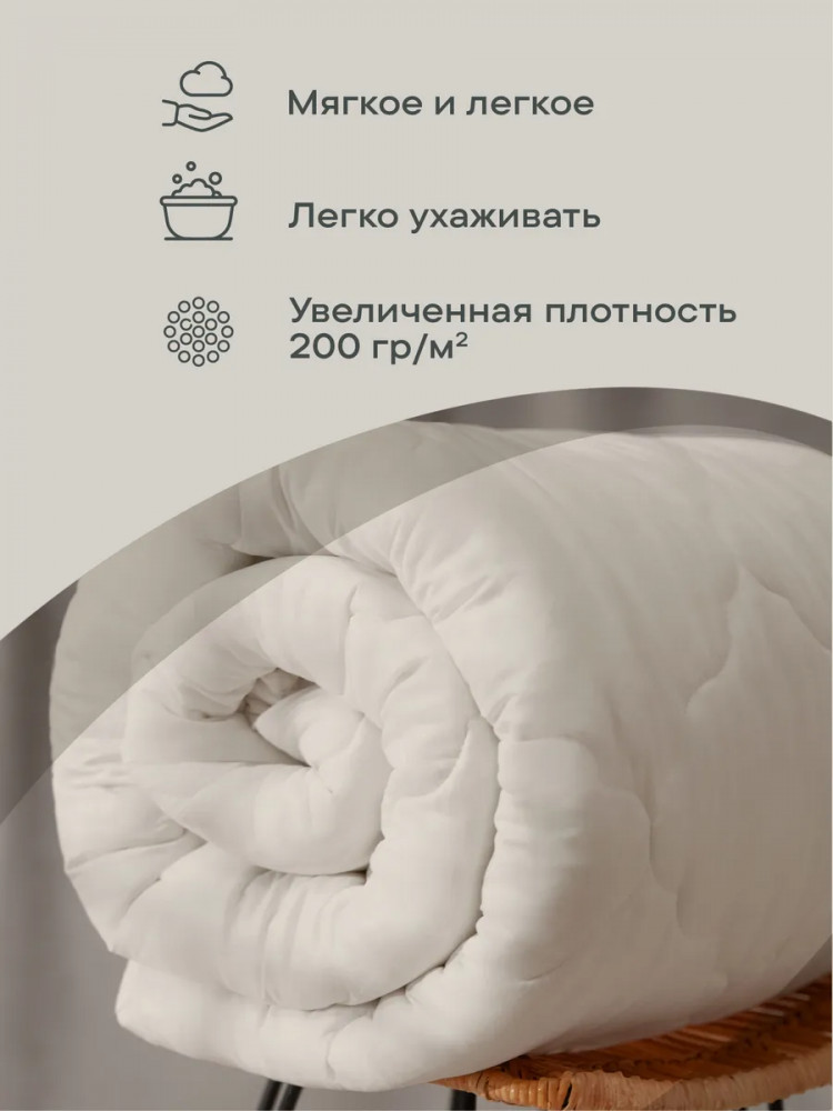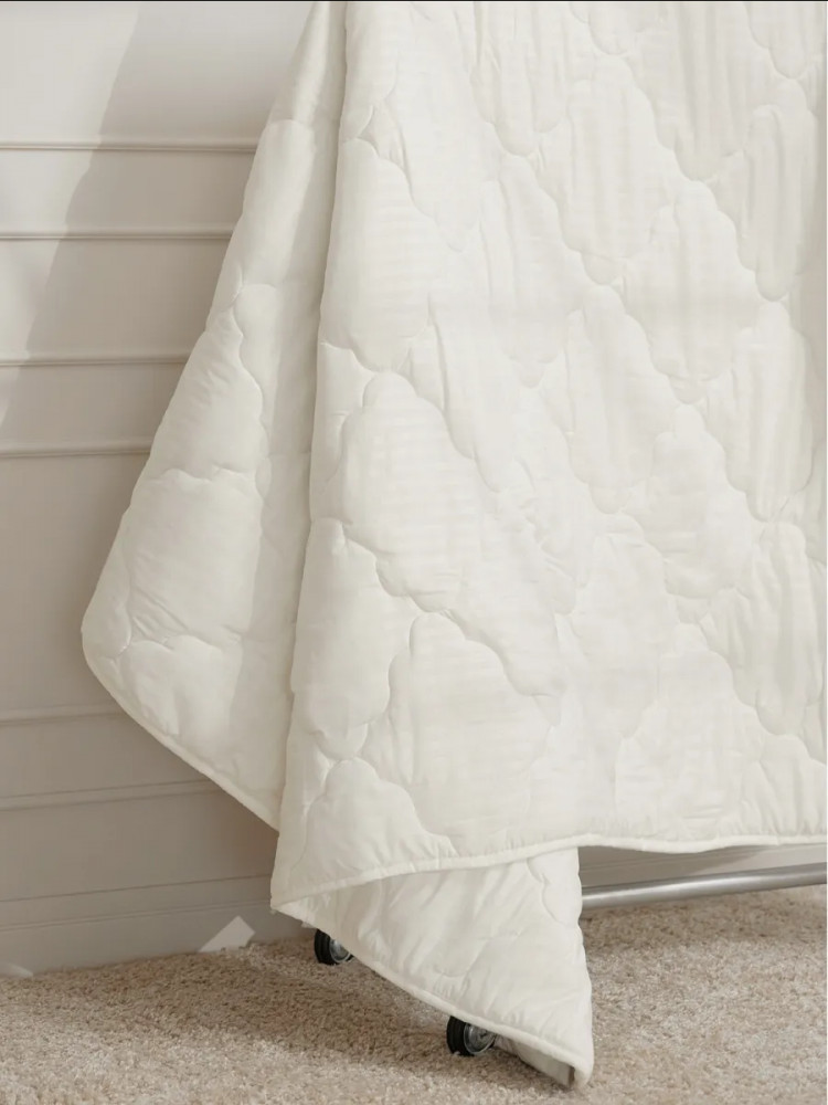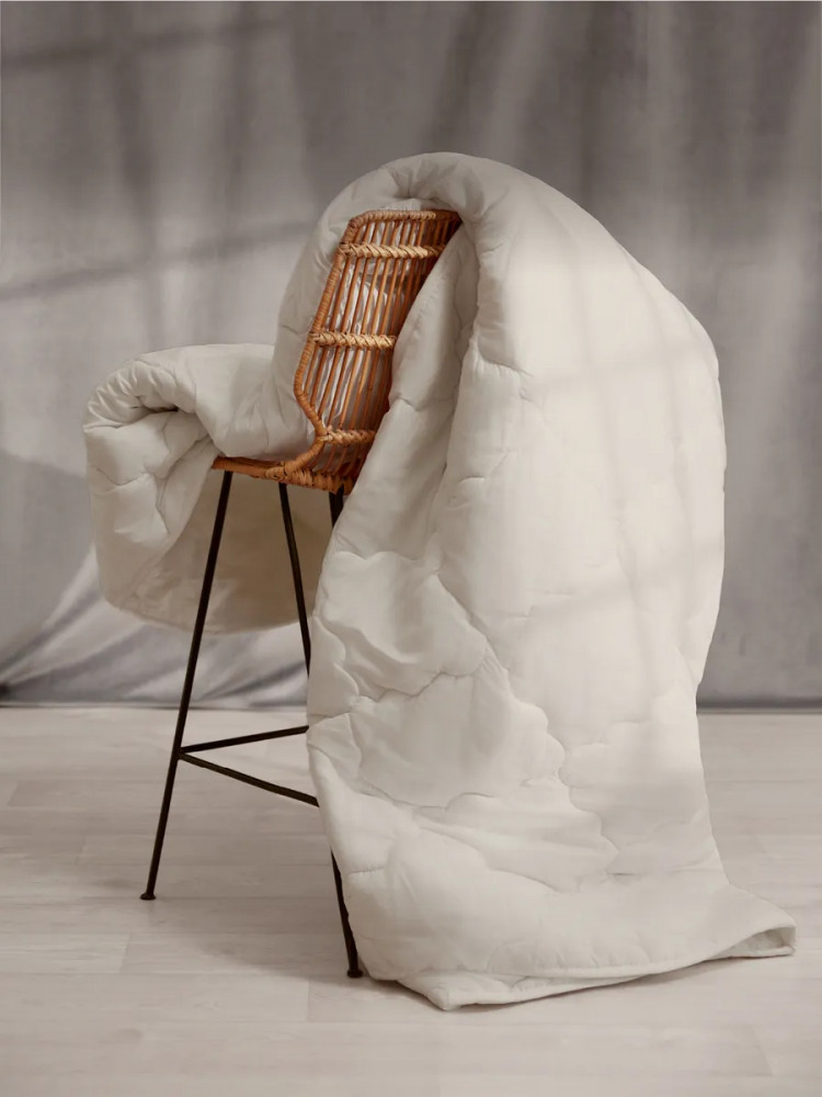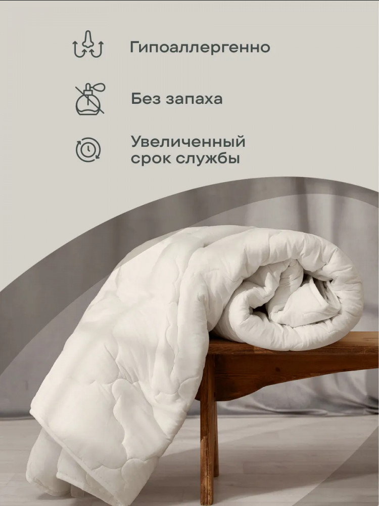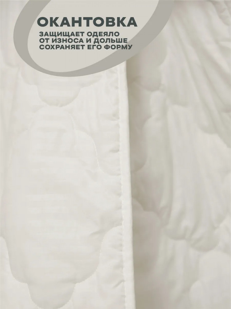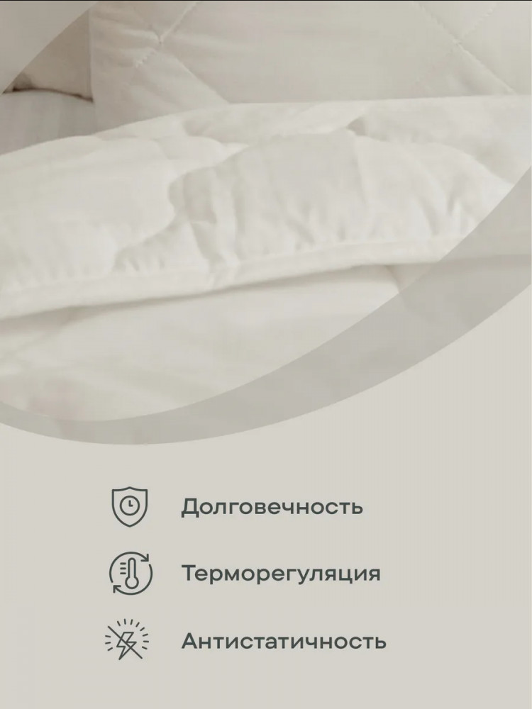 Искусственный наполнитель — лебяжий пух не накапливает посторонних запахов, полностью гипоаллергенный, в нем не развиваются бактерии и микроорганизмы, гигроскопичный. Одеяло легкое в уходе — можно стирать в стиральной машине, быстро сохнет после стирки. Чехол — микрофибра сливочного цвета с атласным кантом контрастного синего цвета. Наполнитель — воздушное, но упругое силиконизированное волокно.