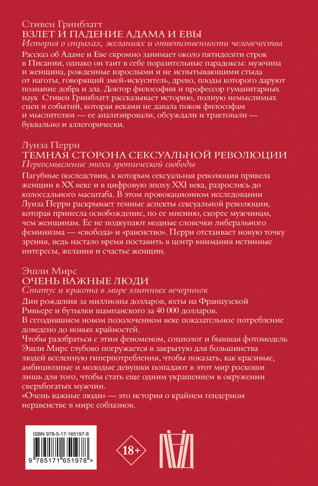 Пагубные последствия, к которым сексуальная революция привела женщин в XX веке и в цифровую эпоху XXI века, разрослись до колоссального масштаба. В этом провокционном исследовании Луиза Перри раскрывает темные аспекты сексуальной революции, которая принесла освобождение, по ее мнению, скорее мужчинам, чем женщинам. Ее не подкупают модные словечки либерального феминизма — «свобода» и «равенство». Перри отстаивает новую точку зрения, ведь настало время поставить в центр внимания истинные интересы, желания и счастье женщин.