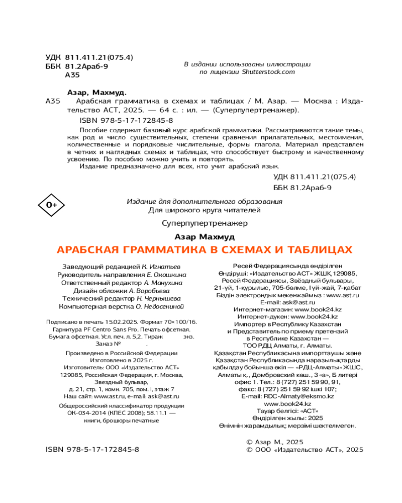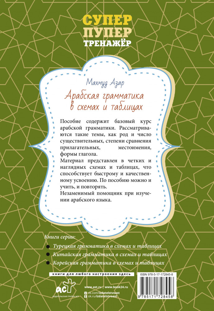 💳 Оплатить за товар можно при получении 🇰🇿 Есть бесплатная доставка по Казахстану от 1 дня 🎁 Копите бонусы с каждой покупки Серия: Суперпупертренажер Пособие содержит базовый курс арабской грамматики. Рассматриваются такие темы, как род и число существительных, степени сравнения прилагательных, местоимения, количественные и порядковые числительные, формы глагола. Материал представлен в четких и наглядных схемах и таблицах, что способствует быстрому и качественному усвоению. По пособию можно учить и повторять. |
