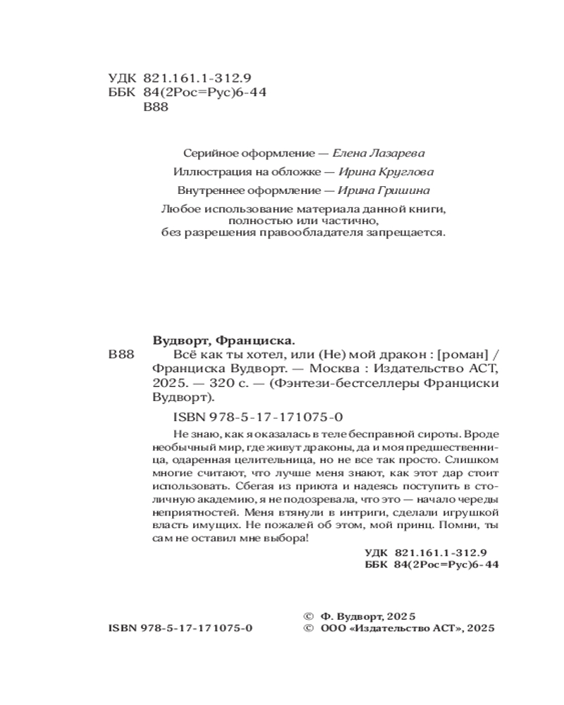 💳 Оплатить за товар можно при получении 🇰🇿 Есть бесплатная доставка по Казахстану от 1 дня 🎁 Копите бонусы с каждой покупки Серия: Фэнтези-бестселлеры Франциски Вудворт Не знаю, как я оказалась в теле бесправной сироты. Вроде необычный мир, где живут драконы, да и моя предшественница, одаренная целительница, но не все так просто. Слишком многие считают, что лучше меня знают, как этот дар стоит использовать. Сбегая из приюта и надеясь поступить в столичную академию, я не подозревала, что это — начало череды неприятностей. Меня втянули в интриги, сделали игрушкой власть имущих. Не пожалей об этом, мой принц. Помни, ты сам не оставил мне выбора! |