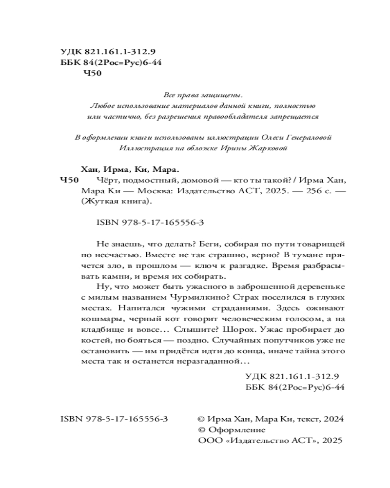 Серия: Жуткая книга Не знаешь, что делать? Беги, собирая по пути товарищей по несчастью. Вместе не так страшно, верно? В тумане прячется зло, в прошлом — ключ к разгадке. Время разбрасывать камни, и время их собирать. Ну, что может быть ужасного в заброшенной деревеньке с милым названием Чурмилкино? Страх поселился в глухих местах. Напитался чужими страданиями. Здесь оживают кошмары, черный кот говорит человеческим голосом, а на кладбище и вовсе... Слышите? Шорох. Ужас пробирает до костей, но бояться — поздно. Случайных попутчиков уже не остановить — им придётся идти до конца, иначе тайна этого места так и останется неразгаданной... |