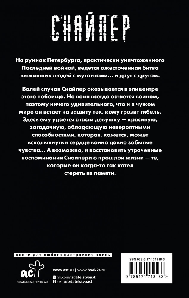 💳 Оплатить за товар можно при получении 🇰🇿 Есть бесплатная доставка по Казахстану от 1 дня 🎁 Копите бонусы с каждой покупки Серия: Снайпер Дмитрий Силлов На руинах Петербурга, практически уничтоженного Последней войной, ведется ожесточенная битва выживших людей с мутантами... и друг с другом. |