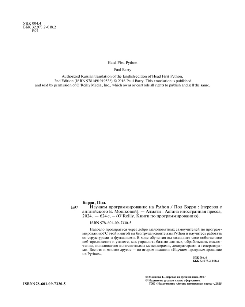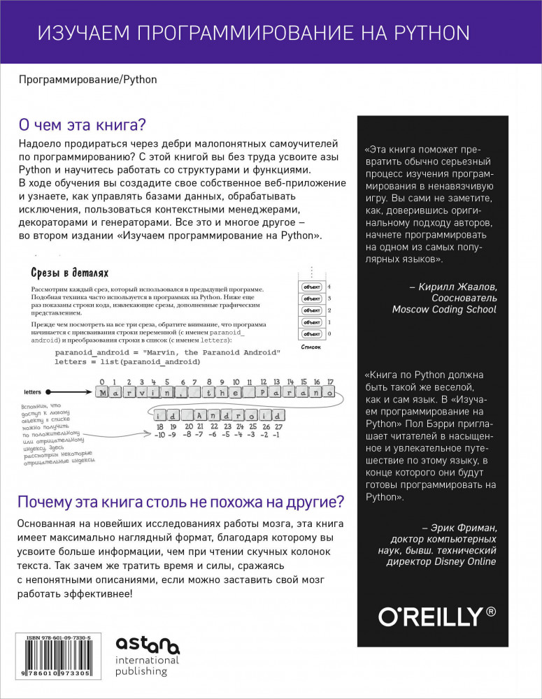 💳 Оплатить за товар можно при получении 🇰🇿 Есть бесплатная доставка по Казахстану от 1 дня 🎁 Копите бонусы с каждой покупки Серия: O’Reilly. Книги по программированию Надоело продираться через дебри малопонятных самоучителей по программированию? С этой книгой вы без труда усвоите азы Python и научитесь работать со структурами и функциями. В ходе обучения вы создадите свое собственное веб-приложение и узнаете, как управлять базами данных, обрабатывать исключения, пользоваться контекстными менеджерами, декораторами и генераторами. Все это и многое другое — во втором издании «Изучаем программирование на Python». |