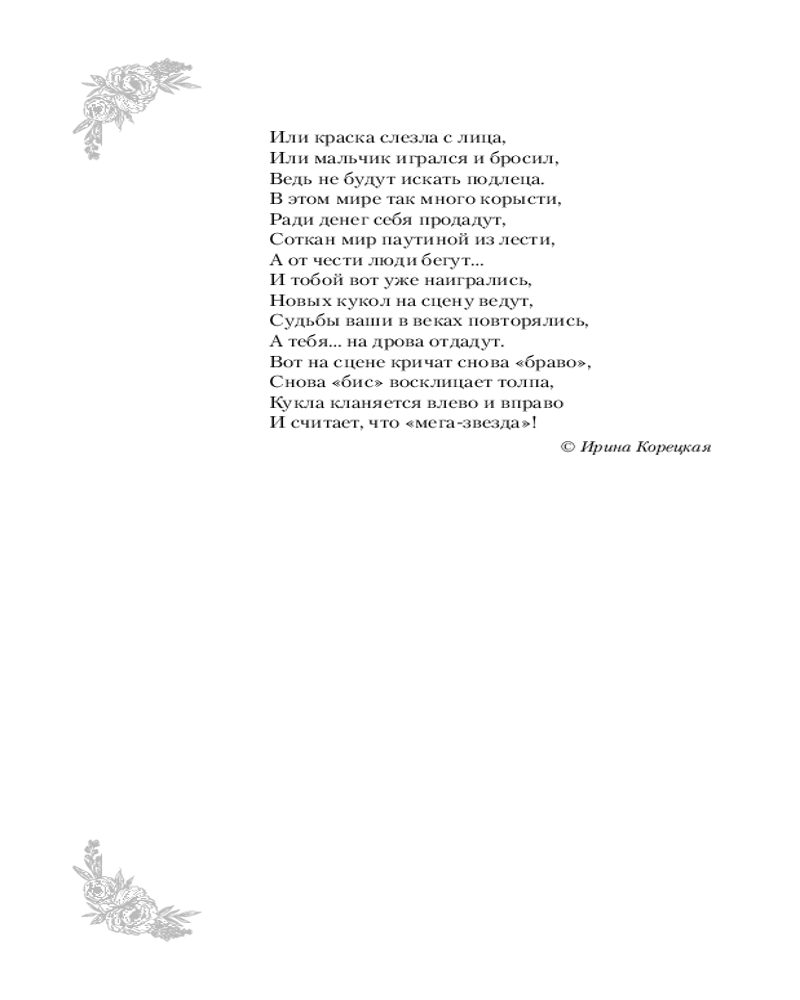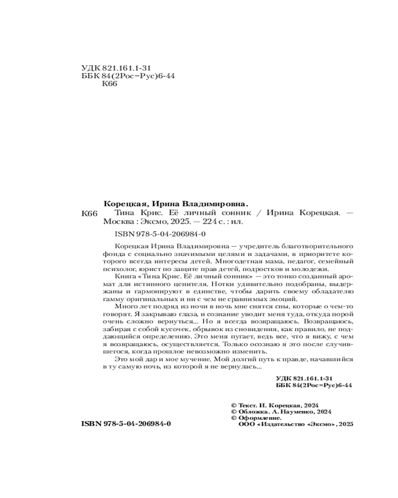 В данный момент этот товар отсутствует в продаже. Возможно, у нас найдется аналогичный или похожий товар здесь. Серия: Остросюжетная беллетристика Корецкая Ирина Владимировна — учредитель благотворительного фонда с социально значимыми целями и задачами, в приоритете которого всегда интересы детей. Многодетная мама, педагог, семейный психолог, юрист по защите прав детей, подростков и молодежи.