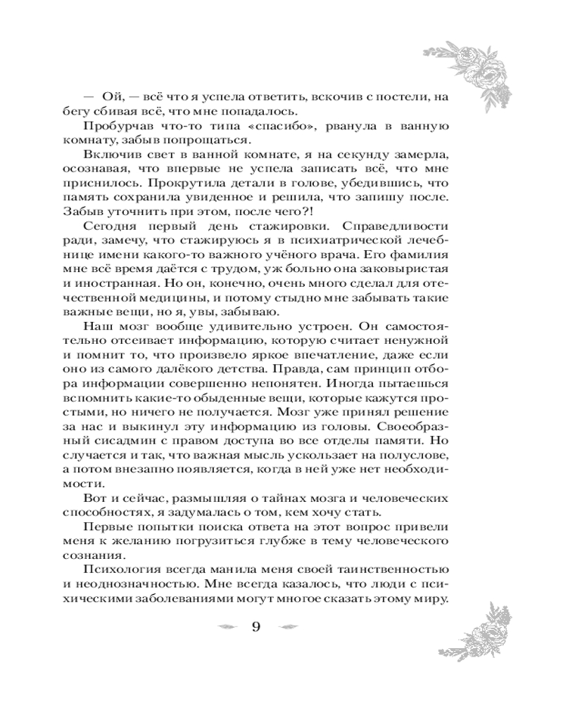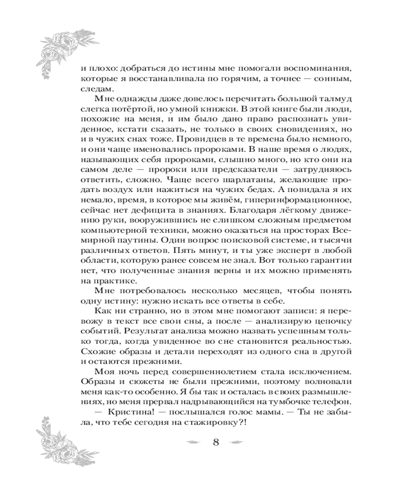 Много лет подряд из ночи в ночь мне снятся сны, которые о чем-то говорят. Я закрываю глаза, и сознание уводит меня туда, откуда порой очень сложно вернуться... Но я всегда возвращаюсь. Возвращаюсь, забирая с собой кусочек, обрывок из сновидения, как правило, не поддающийся определению. Это меня пугает, ведь все, что я вижу, с чем я возвращаюсь, осуществляется. Только осознаю я это после случившегося, когда прошлое невозможно изменить.