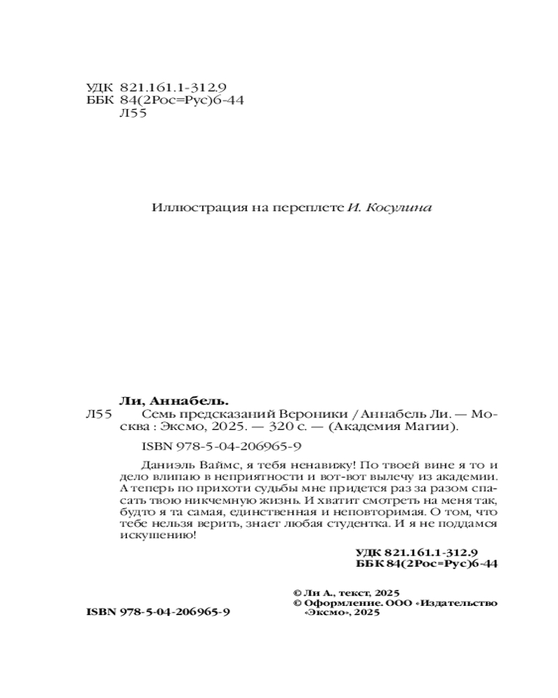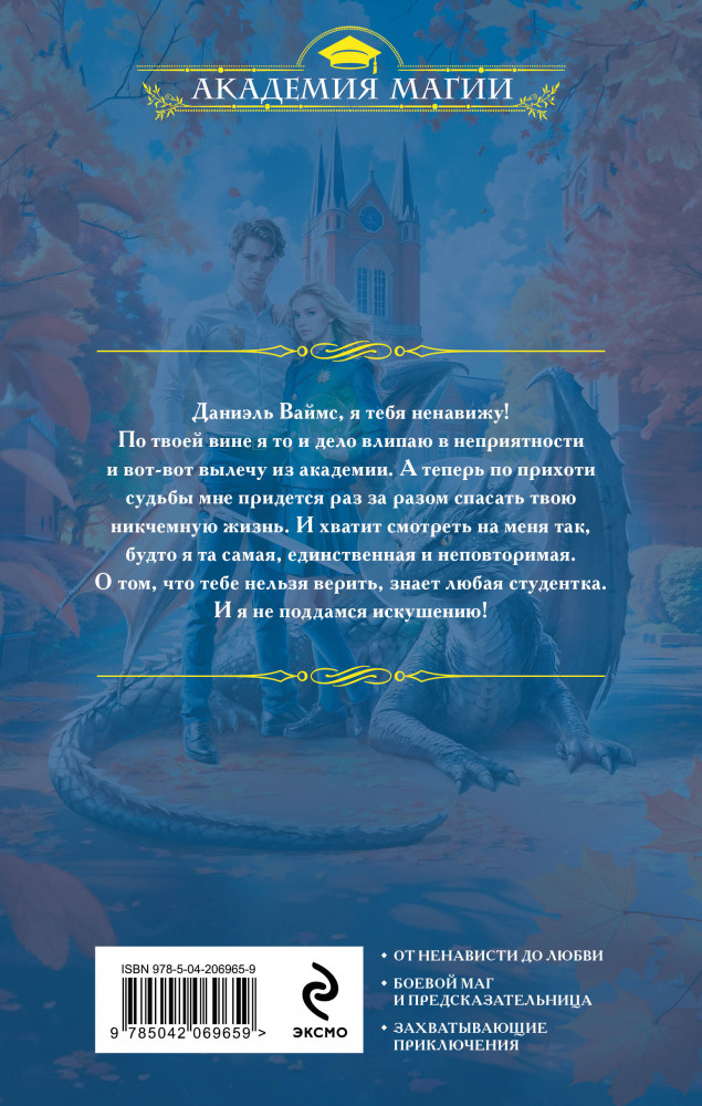 💳 Оплатить за товар можно при получении 🇰🇿 Есть бесплатная доставка по Казахстану от 1 дня 🎁 Копите бонусы с каждой покупки Серия: Академия магии Даниэль Ваймс, я тебя ненавижу! По твоей вине я то и дело влипаю в неприятности и вот-вот вылечу из академии. А теперь по прихоти судьбы мне придется раз за разом спасать твою никчемную жизнь. И хватит смотреть на меня так, будто я та самая, единственная и неповторимая. О том, что тебе нельзя верить, знает любая студентка. И я не поддамся искушению! |