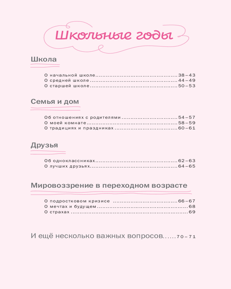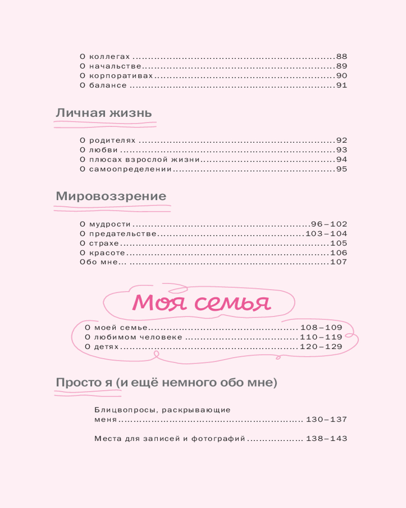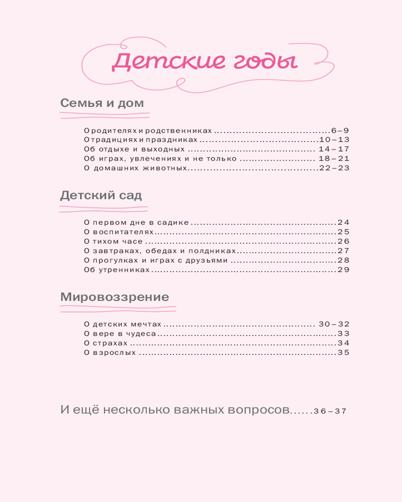 Эта книга — не просто семейный альбом или сборник вопросов. Эта книга — ваше признание в любви к себе. Если хотите, можете отвечать на вопросы последовательно, ведь все они расположены хронологически — от детства к нынешнему возрасту. Но на самом деле никаких правил нет! Можете начать с любого места и дальше ориентироваться на свое состояние, переходя от раздела к разделу в зависимости от приходящих воспоминаний. Пусть эта книга станет вашим шагом к себе и своему уникальному внутреннему миру.