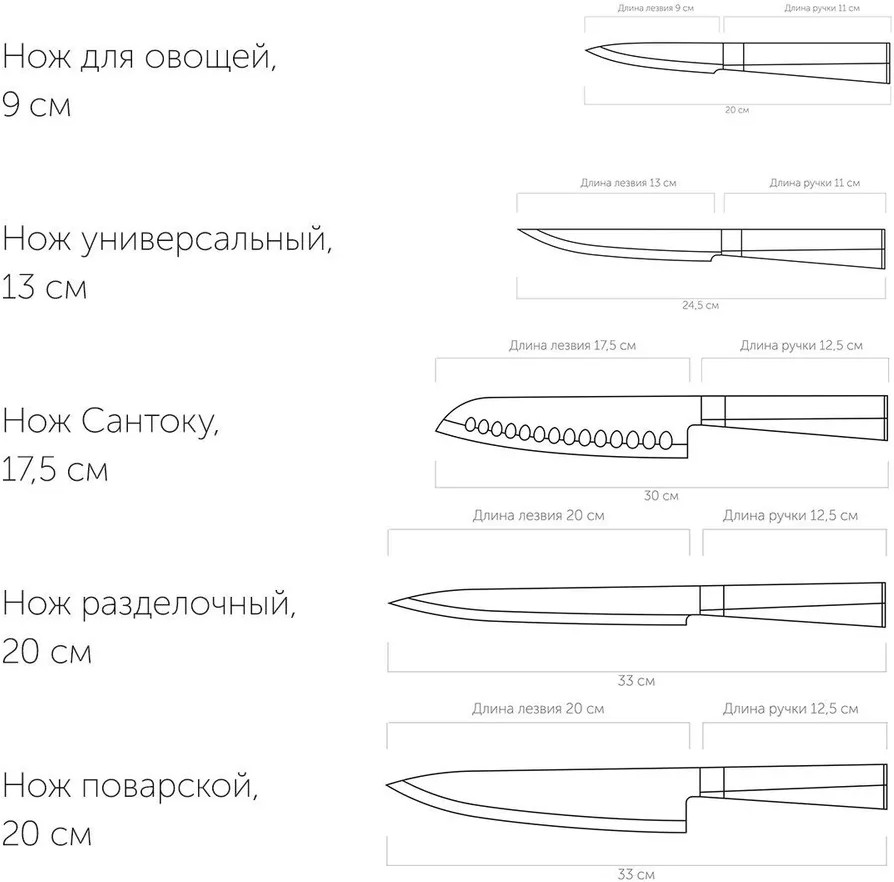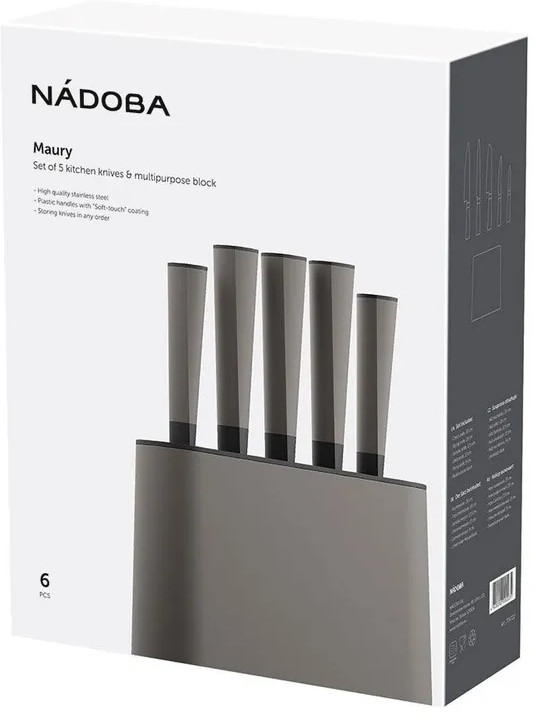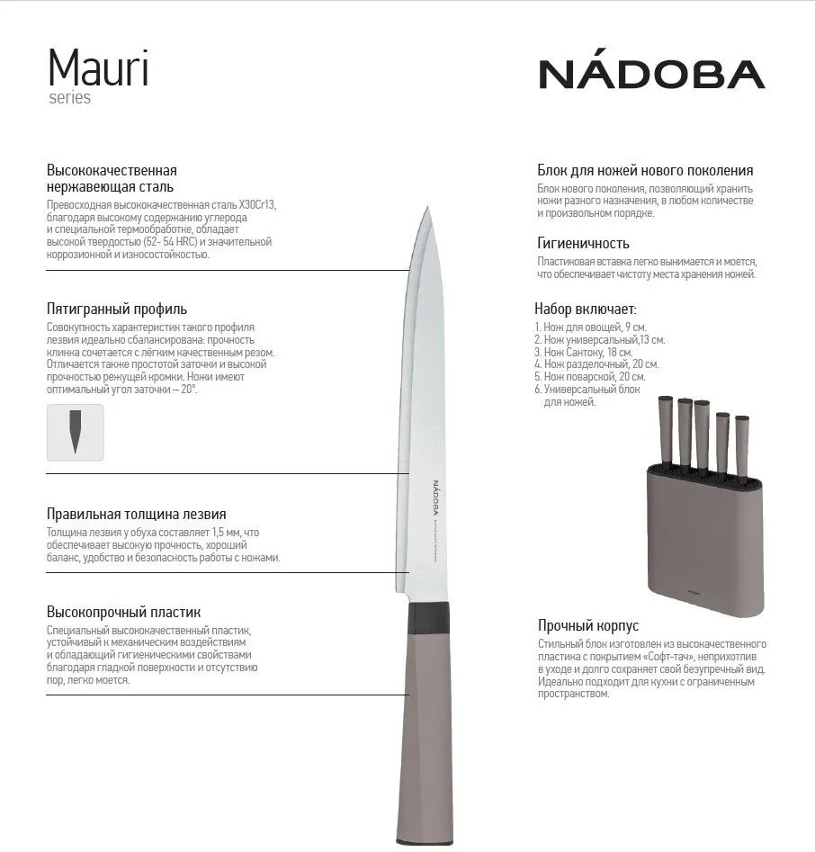 Ножи серии Maury выполнены из высококачественной нержавеющей стали с высокой твердостью по шкале Роквелла (52- 54 HRC). Их лезвия остаются острыми долгое время. Эстетичные и удобные ручки с софт-тач поверхностью приятно ложатся в руку. На торце ручек имеются иконки для визуального определения нужного ножа. Гигиеничный лаконичный блок для хранения ножей. Гарантия на ножи серии Maury 5 лет.