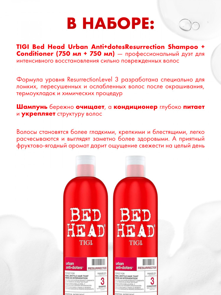 Tigi Набор по уходу за волосами для женщин «Bed Head Urban Antidotes Resurrection»В данный момент этот товар отсутствует в продаже. Возможно, у нас найдется аналогичный или похожий товар здесь. Восстановите сухие и поврежденные волосы с помощью шампуня и кондиционера Bed Head Resurrection! Шампунь для восстановления поврежденных волос помогает восстановить серьезные повреждения волос, повысить их прочность и разгладить вьющиеся, поврежденные волосы. Он глубоко очищает и помогает очистить волосы от грязи и пыли. Кондиционер для восстановления глубоко питает, восстанавливает видимые признаки повреждения и разглаживает поврежденные волосы. |