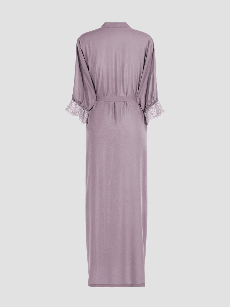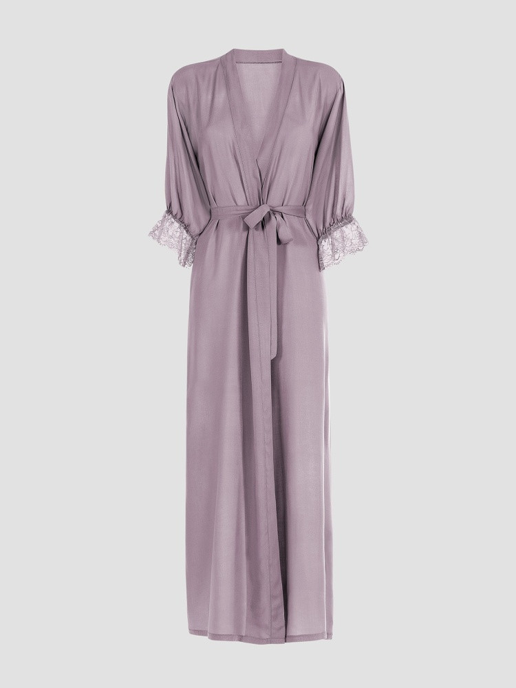 Материал халата Кристина – вискозный шелк. Изделия из вискозы легкие мягкие приятные на ощупь в них комфортно спать. Это одна из лучших тканей для сорочек и пижам. Шелковистая вискоза прекрасно подходит для людей с чувствительной кожей никогда не вызывает раздражения. Это гигроскопичный и воздухопроницаемый материал который не накапливает статическое электричество. Вискоза не скатывается даже спустя время. Изящный халат (пеньюар) Кристина – это утонченный дизайн нежный оттенок и ажурное кружево отделки. Удлиненная модель выполнена в стиле классического кимоно с поясом на запах. Укороченные рукава украшены кружевными манжетами-рюшами. Рюши в викторианском стиле – один из модных трендов последних лет в дизайне одежды. В комплекте с халатом предлагается ночная сорочка Кристина с кружевной отделкой.