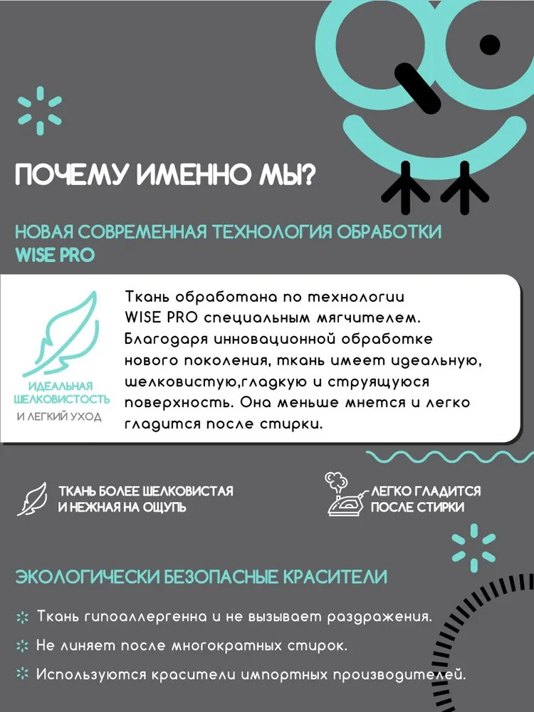 💳 Оплатить за товар можно при получении 🇰🇿 Есть бесплатная доставка по Казахстану от 1 дня 🎁 Копите бонусы с каждой покупки Постельное бельё от торговой марки «Uniqcute» изготавливается из натуральной ткани — поплина. Благодаря особому переплетению волокон, комплекты постельного белья из поплина не требуют тщательного ухода, и в то же время долговечны и износостойки. Очень прочная ткань полотняного переплетения, абсолютно экологична, не вызывает аллергии и обладает высокими эксплуатационными свойствами. При соблюдении рекомендаций по уходу выдерживает большое количество стирок, сохраняя яркость и мягкость. Не подвержена образованию катышков, хорошо удерживает тепло, превосходно впитывает влагу и позволяет телу «дышать». Способ застегивания наволочки — клапан, пододеяльника — отверстие без застежки по краю изделия. |