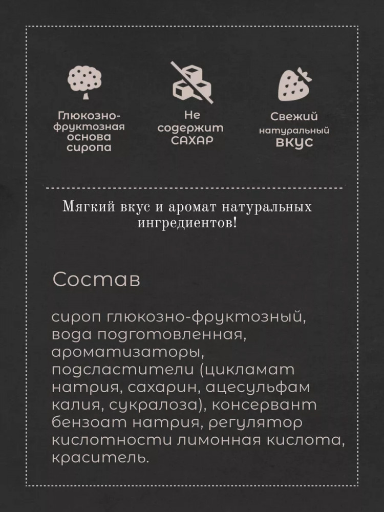 • и это еще не все! С нашим сиропом вы сможете приготовить великолепную сладкую выпечку, пропитать коржи, приготовить яркие кремы и соусы. Как топпинг к мороженому и кондитерским изделиям, он поразит вас своими чистыми и натуральными вкусами и ароматами;