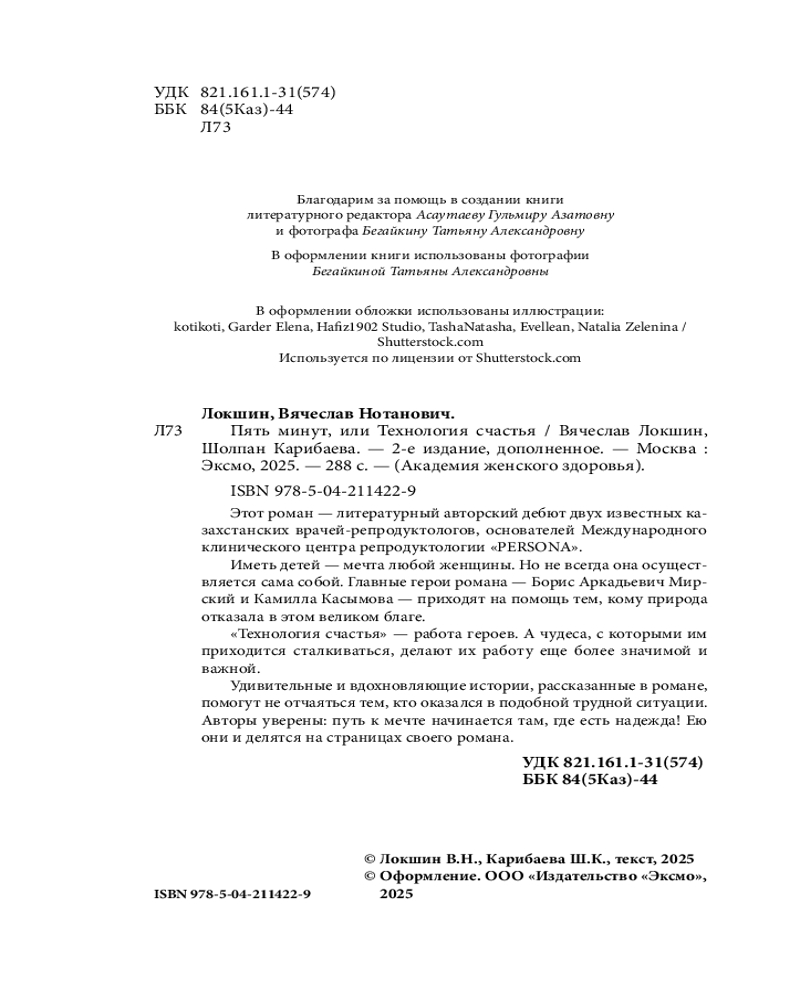 Пять минут, или Технология счастья. Дополненное изданиеВячеслав Нотанович Локшин, Шолпан Кенесовна Карибаева В данный момент этот товар отсутствует в продаже. Возможно, у нас найдется аналогичный или похожий товар здесь. Серия: Академия женского здоровья Эта книга появилась на свет благодаря врачебному опыту, искреннему желанию помочь, удивительным достижениям науки и вдохновляющим историям тех, кто испытал радость материнства и отцовства. Ее герои — врачи, приходящие на помощь, и семьи, доверившиеся им. Возможности медицины не безграничны, путь может быть долгим и непростым. Но мечта начинается лишь там, где есть надежда. Этот роман — литературный авторский дебют двух известных казахстанских врачей-репродуктологов, основателей Международного клинического центра репродуктологии «PERSONA». |