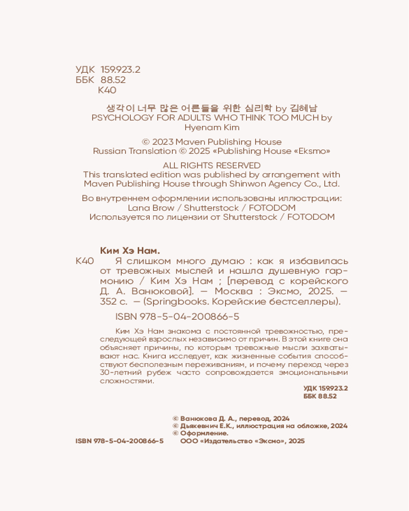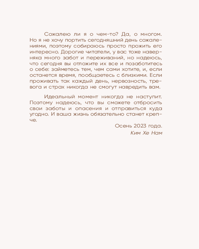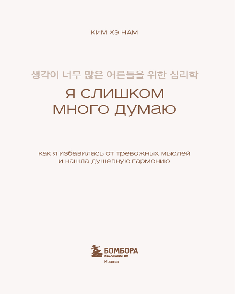 💳 Оплатить за товар можно при получении 🇰🇿 Есть бесплатная доставка по Казахстану от 1 дня 🎁 Копите бонусы с каждой покупки Серия: Springbooks. Корейские бестселлеры Современные тридцатилетние — одно из самых тревожных поколений. Они находятся в эпицентре стремительно изменяющегося мира, балансируя между карьерой, личной жизнью и неизбежным поиском смысла. Но как быть, если тревожность затягивает словно в болото? Ким Хэ Нам, автор бестселлера «Прожить жизнь заново», не понаслышке знает, каково это — быть взрослым и постоянно ощущать всепоглощающую тревогу по любому поводу. В своей второй книге она расскажет, почему мы стали заложниками тревожных мыслей. Как события нашей жизни влияют на возникновение бессмысленных переживаний. И почему так сложно перешагнуть рубеж в 30 лет и остаться в эмоциональном порядке. Вы снова окажетесь на уютном и теплом психотерапевтическом приеме у Ким Хэ Нам. Она подарит вам новую порцию вдохновения и ощущения обволакивающего спокойствия. |