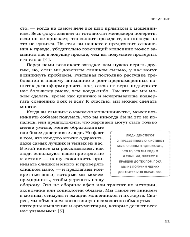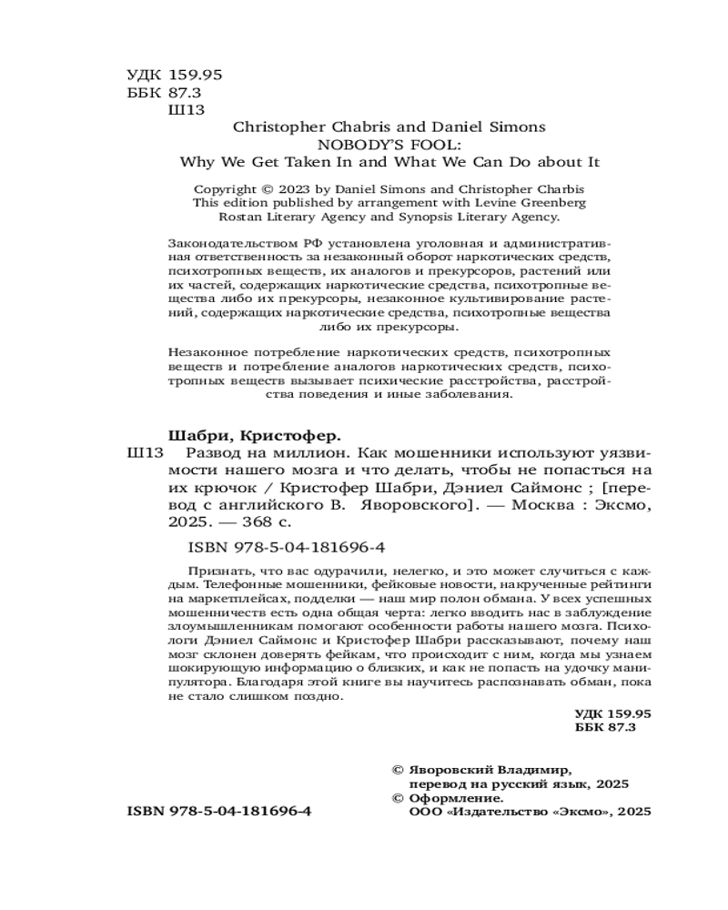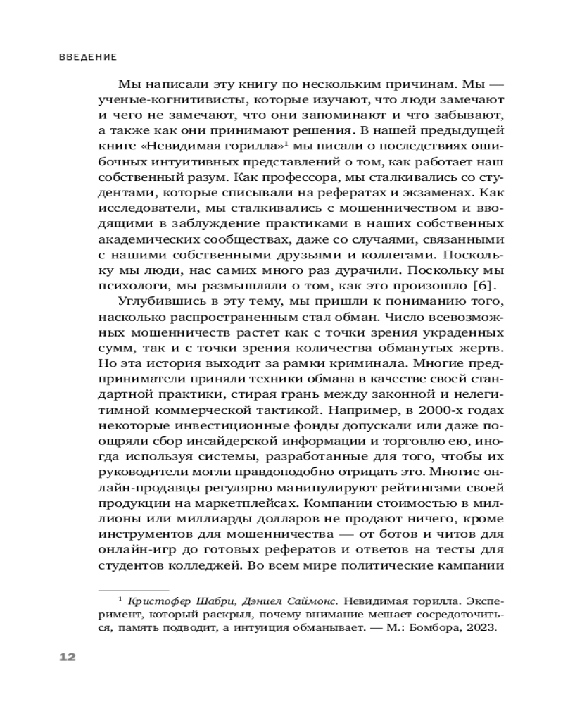Серия: Психологический бестселлер Телефонные мошенники, фейковые новости, накрученные рейтинги на маркетплейсах, подделки — наш мир полон обмана. Психологи Дэниел Саймонс и Кристофер Шабри в течение 10 лет изучали всевозможные примеры мошенничества, чтобы рассказать о ключевых ловушках мышления, которые делают нас уязвимыми. Например, склонность верить всему, что мы видим и слышим, пока не получим четких доказательств обратного, или сила авторитетного мнения. Благодаря этой книге вы научитесь распознавать обман сами и поможете близким не попасться на крючок мошенников. |