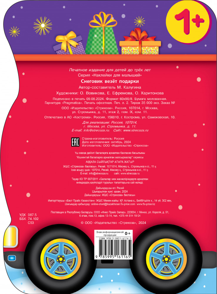 💳 Оплатить за товар можно при получении 🇰🇿 Есть бесплатная доставка по Казахстану от 1 дня 🎁 Копите бонусы с каждой покупки Снеговик работает почтальоном на почте. Перед Новым годом у него очень много дел! Все зверюшки отправляют друг другу посылки с подарками, и нужно успеть доставить всё к празднику! Хорошо, что у него есть волшебный грузовик. Давай и мы отправимся вместе со снеговиком и поможем ему. А с нашими яркими наклейками будет вдвойне интересно! Художник О. Вовикова, Е. Ефремова, О. Харитонова. Для детей до трех лет. |