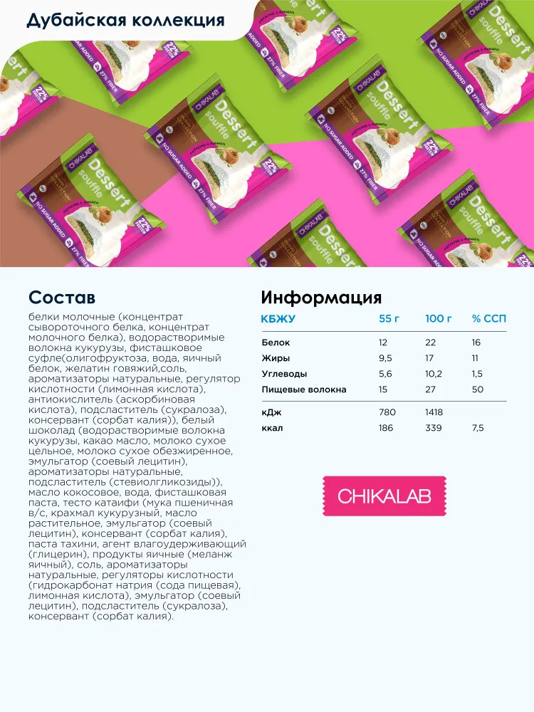 Chikalab Печенье глазированное «Фисташковое суфле с хрустящим тестом»вкусный хрустящее тесто одноразовое В данный момент этот товар отсутствует в продаже. Возможно, у нас найдется аналогичный или похожий товар здесь. Встречайте новинку от Chikalab — Dessert Souffle Dubai Collection — коллекция, вдохновленная всемирно известным Дубайским шоколадом. Восточное прочтение нашего нового десерта раскрывается через воздушное фисташковое суфле и начинку из легендарного теста катаифи. Dessert Souffle — идеальный выбор для тех, кто заботится о своем питании, но не готов отказываться от удовольствия. |